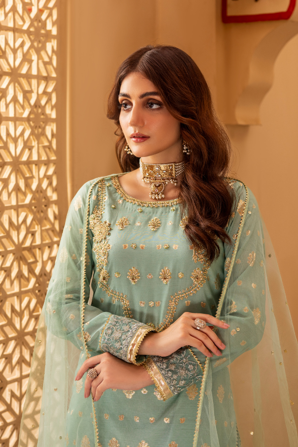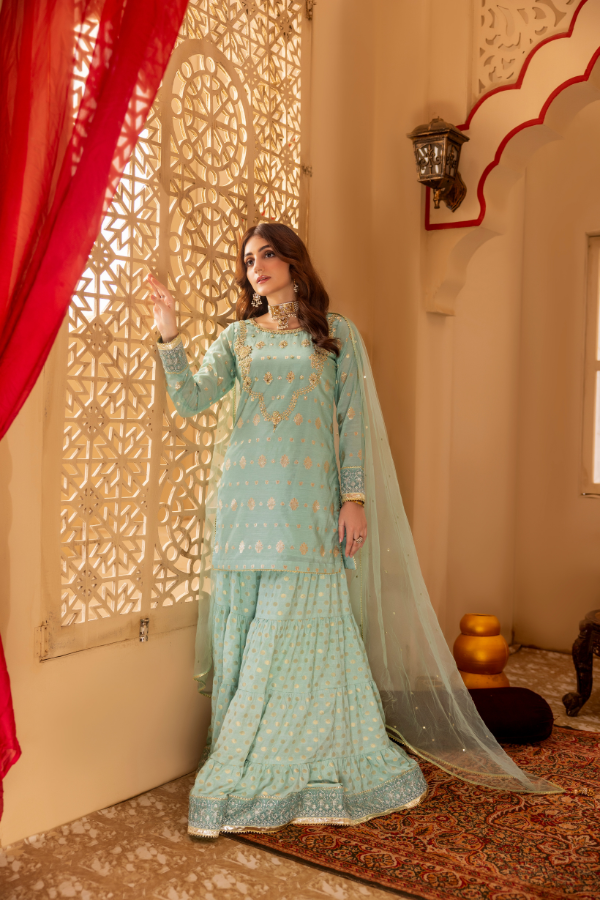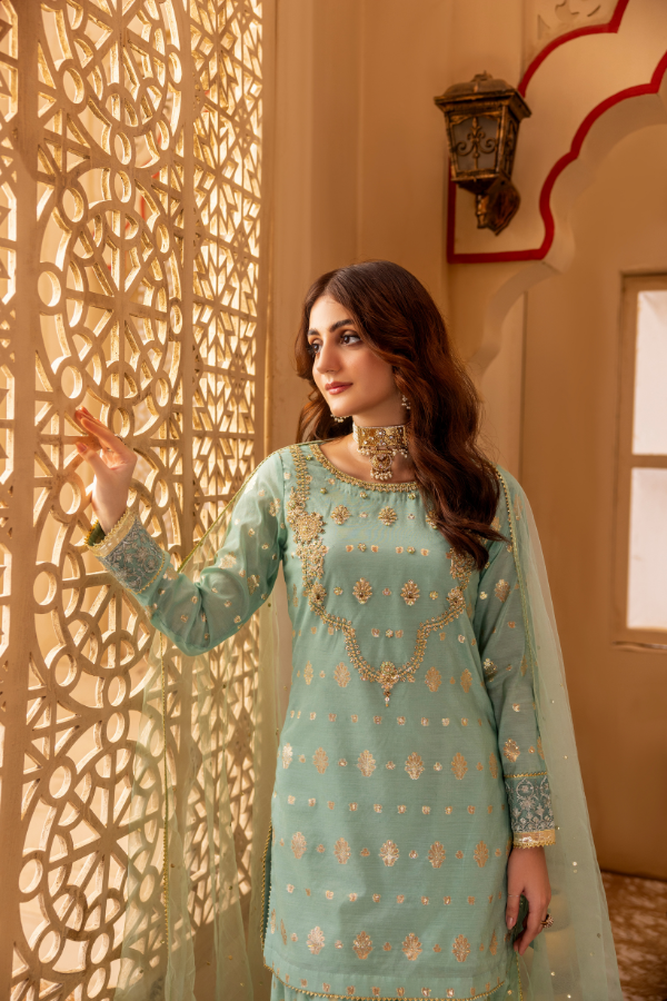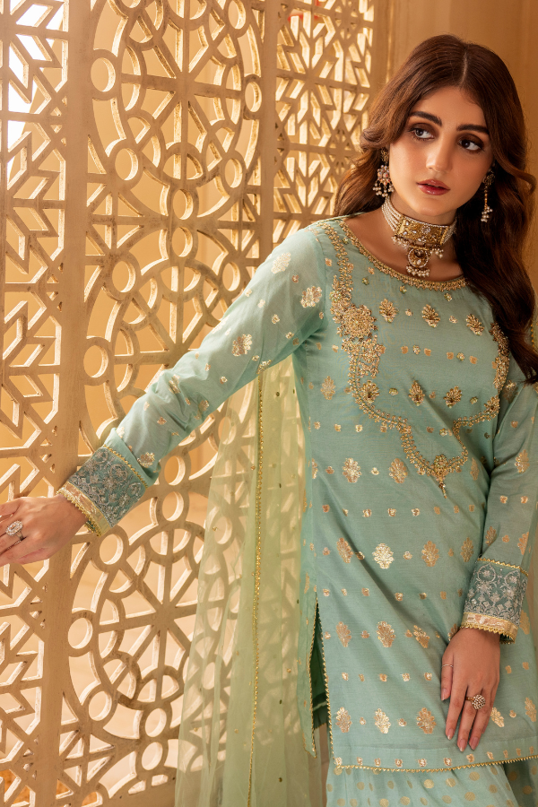 Embrace gracefulness with this Pure Lotus Banarsi ensemble. The short shirt features handwork on the neckline with Kora, Dabka, and Sequin Stones, complemented by embroidered sleeves and daaman with lace. The three-layered embroidered gharara and the dupatta, adorned with Sitara Chan and lace tassels, complete this luxurious outfit, perfect for special celebrations.