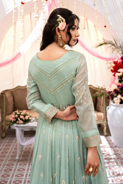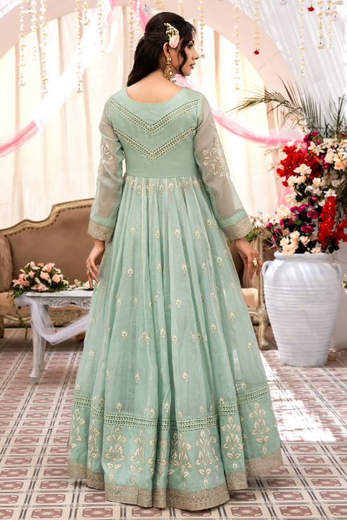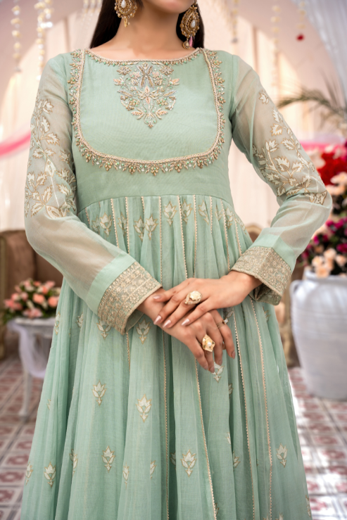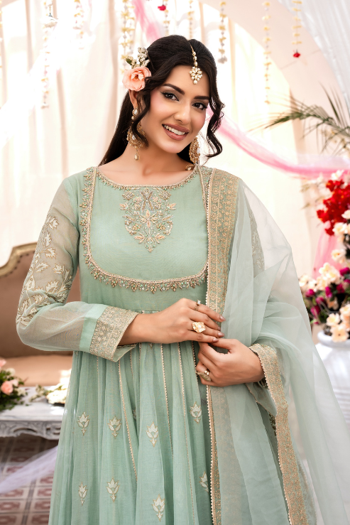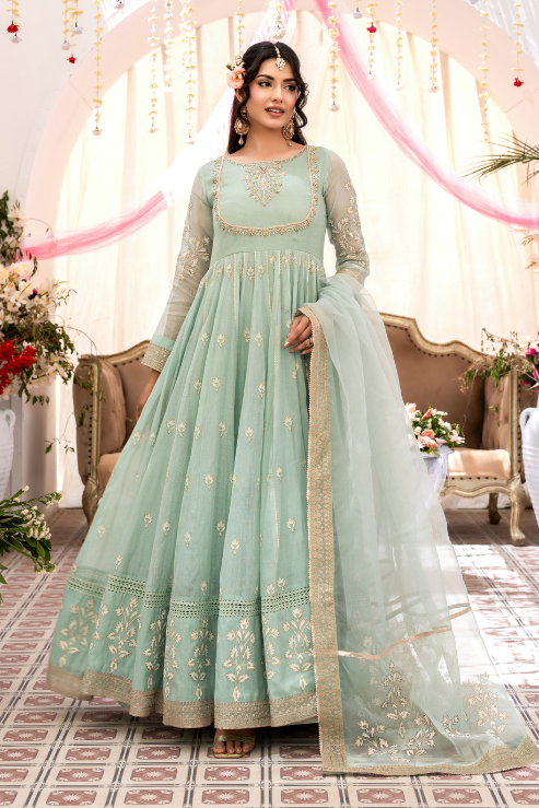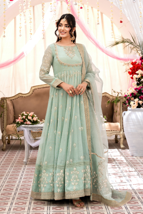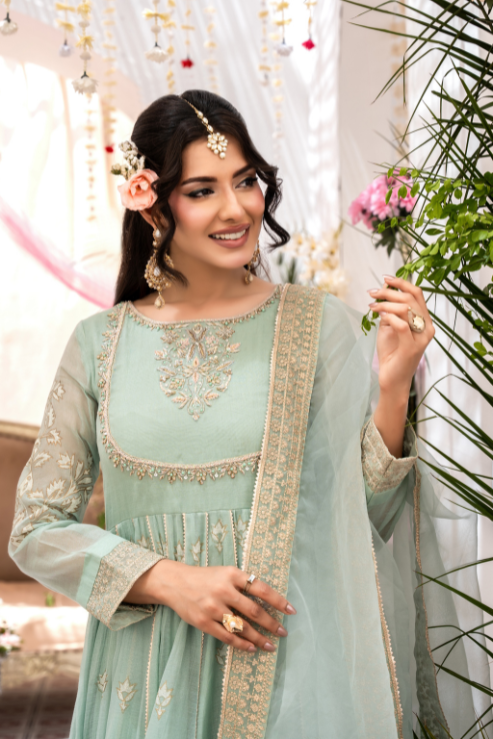 Fall in love with festive finesse—Ayeza’s light blue kalidar frock in luxurious Masuri features delicate resham, kora, and dabka handwork on the neckline, paired with graceful blockprints and embroidery. Styled with a dreamy organza dupatta, finished with four-sided embroidery, it’s your effortless fashion statement.