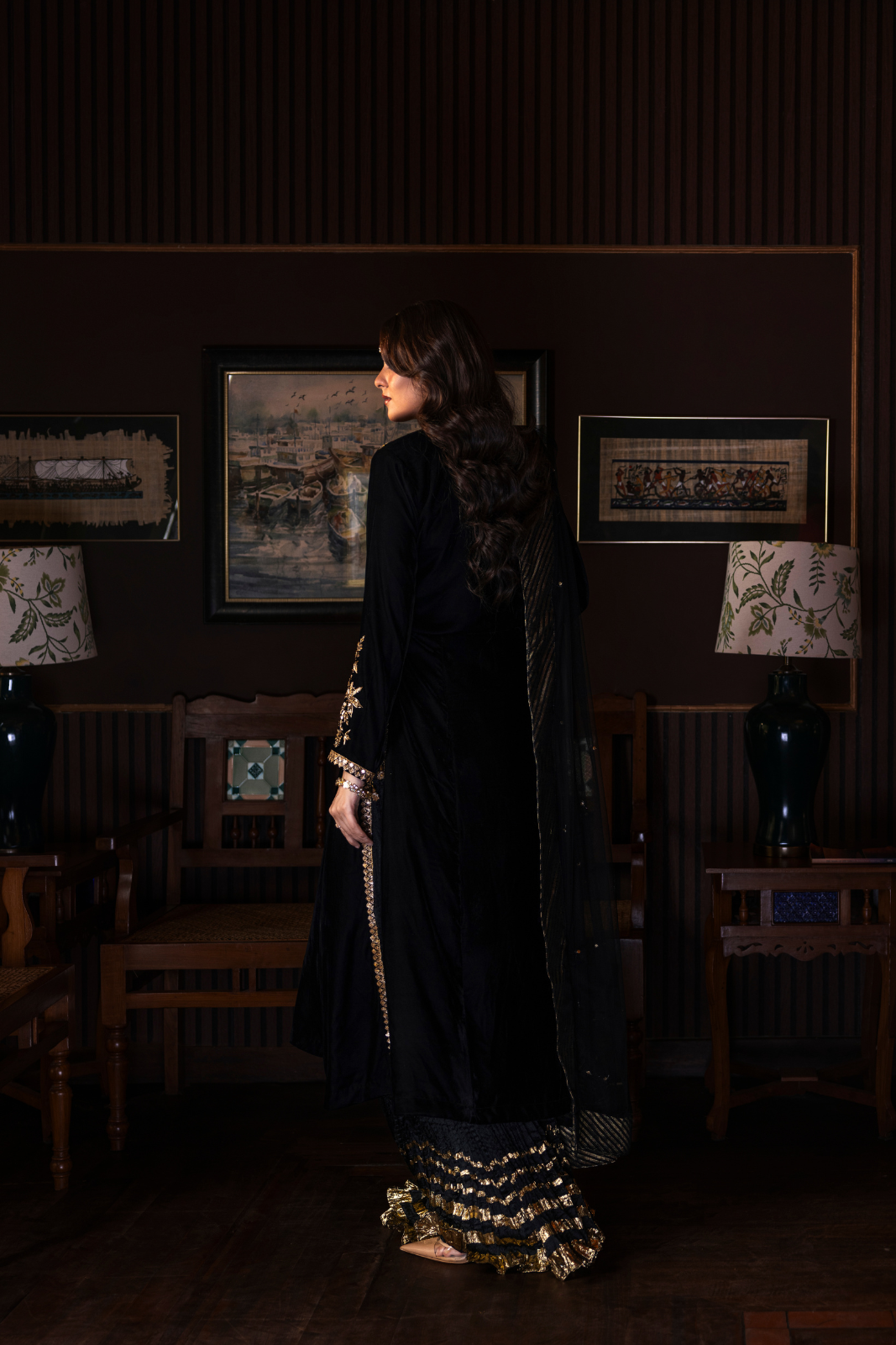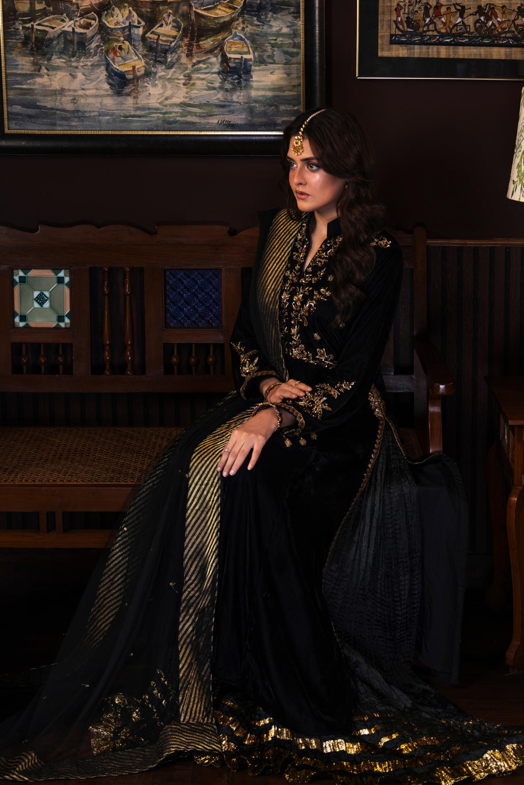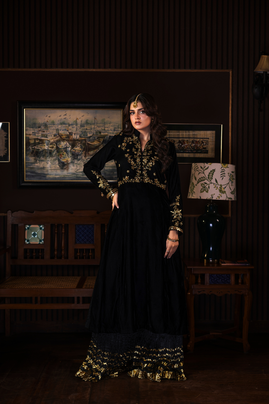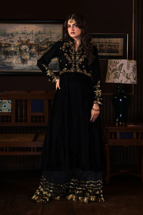 Azhure 3-piece masterpiece in luxurious black velvet with dazzling golden handwork. The long shirt is intricately adorned with Kora, Dabka, and Sitara, while the crush Dhaka pants add a regal charm. The delicate net dupatta, finished with Chan, Sitara, and dori piping, completes this show-stopping ensemble.