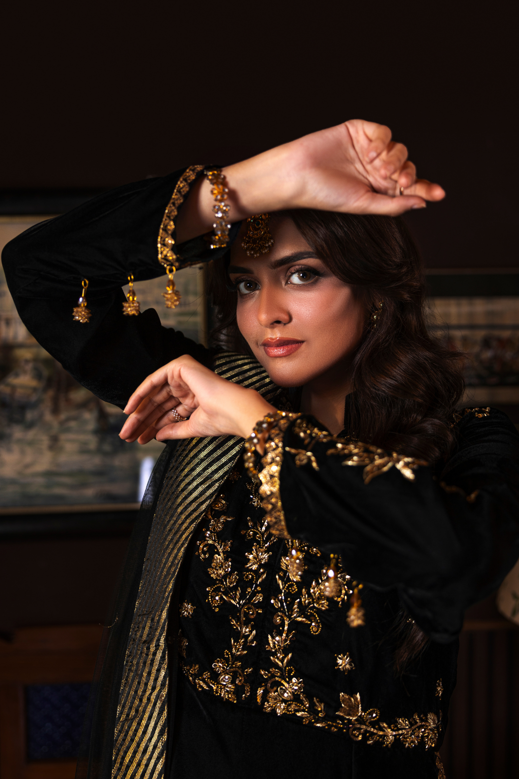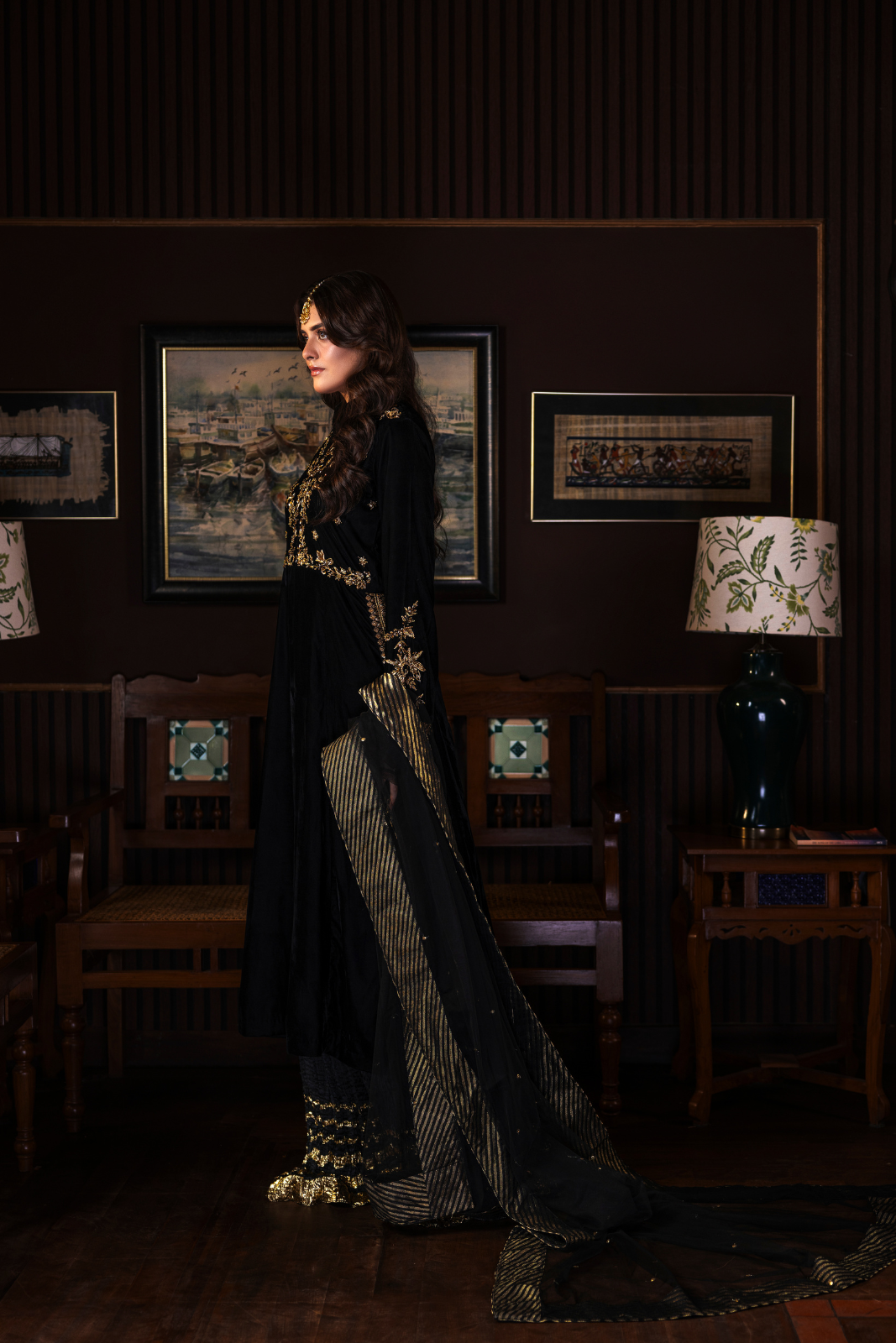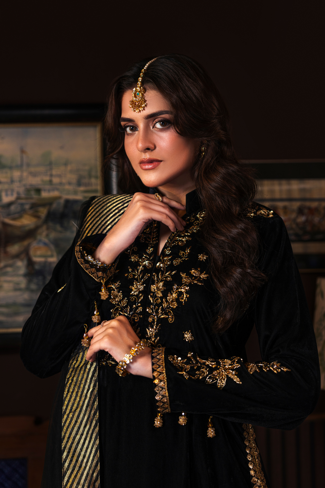 Azhure 3-piece masterpiece in luxurious black velvet with dazzling golden handwork. The long shirt is intricately adorned with Kora, Dabka, and Sitara, while the crush Dhaka pants add a regal charm. The delicate net dupatta, finished with Chan, Sitara, and dori piping, completes this show-stopping ensemble.