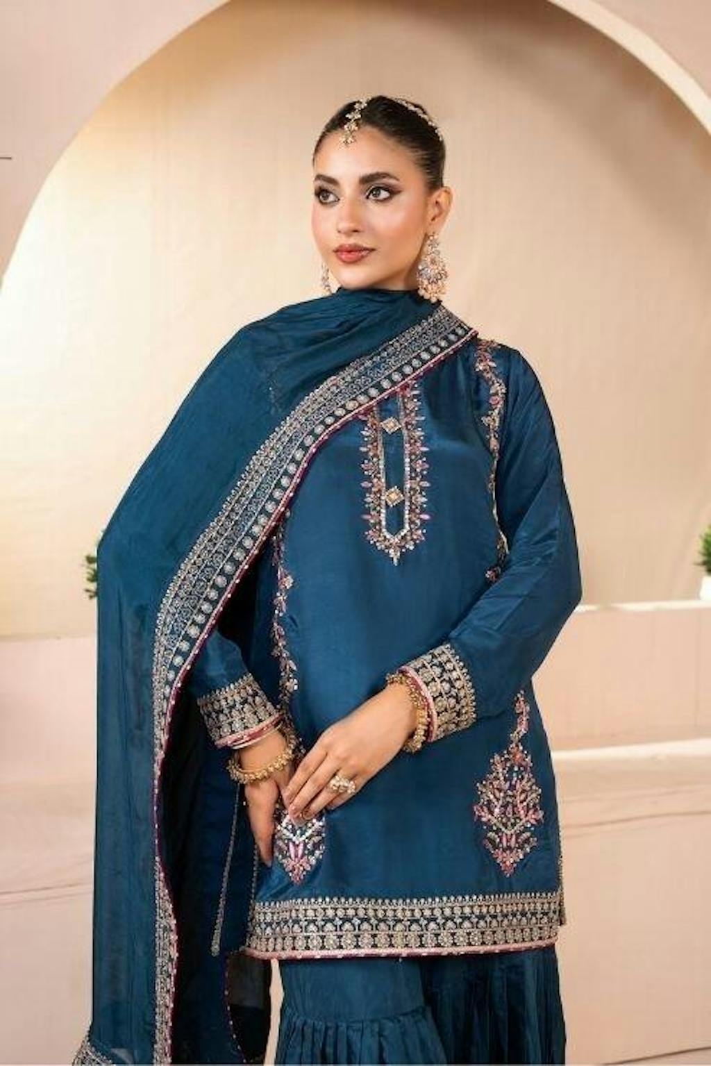 Bottom (Gharara): Paired with a beautifully designed gharara, highlighted with an embroidered border that adds elegance and traditional charm.