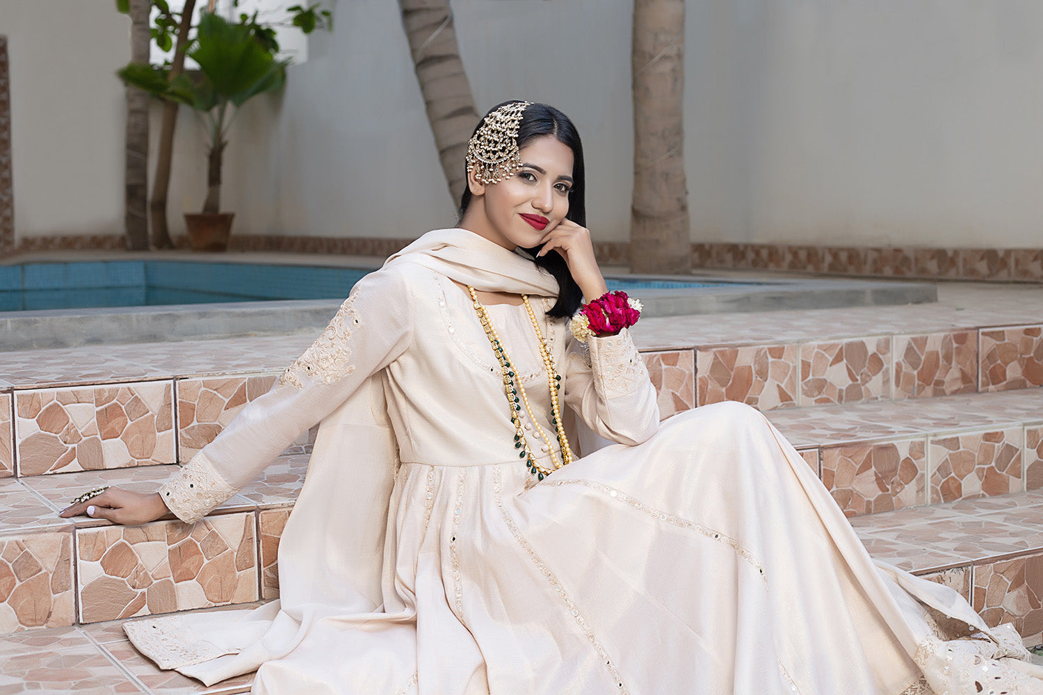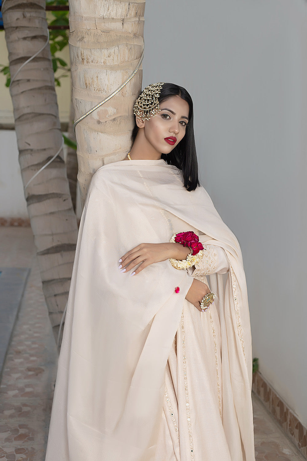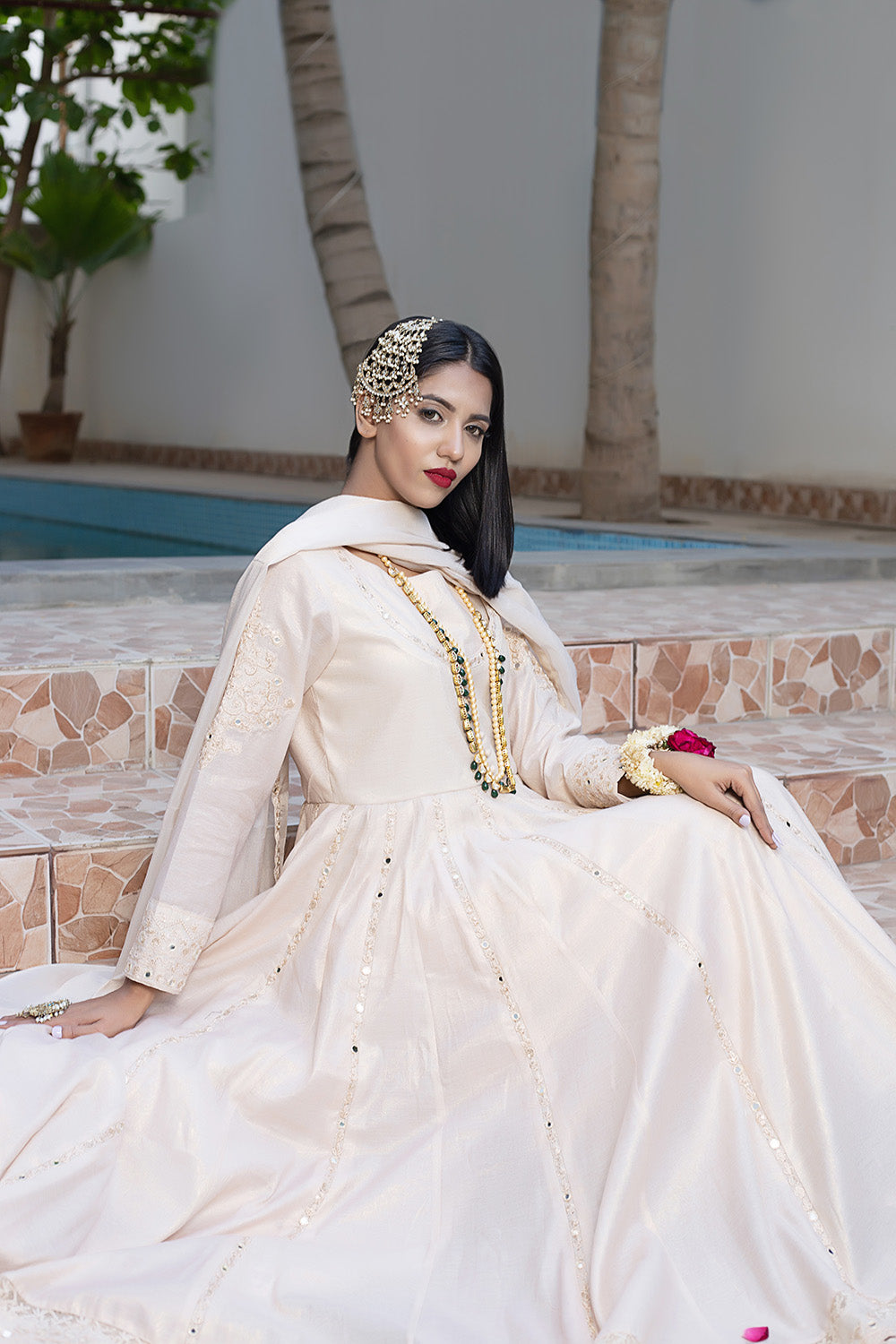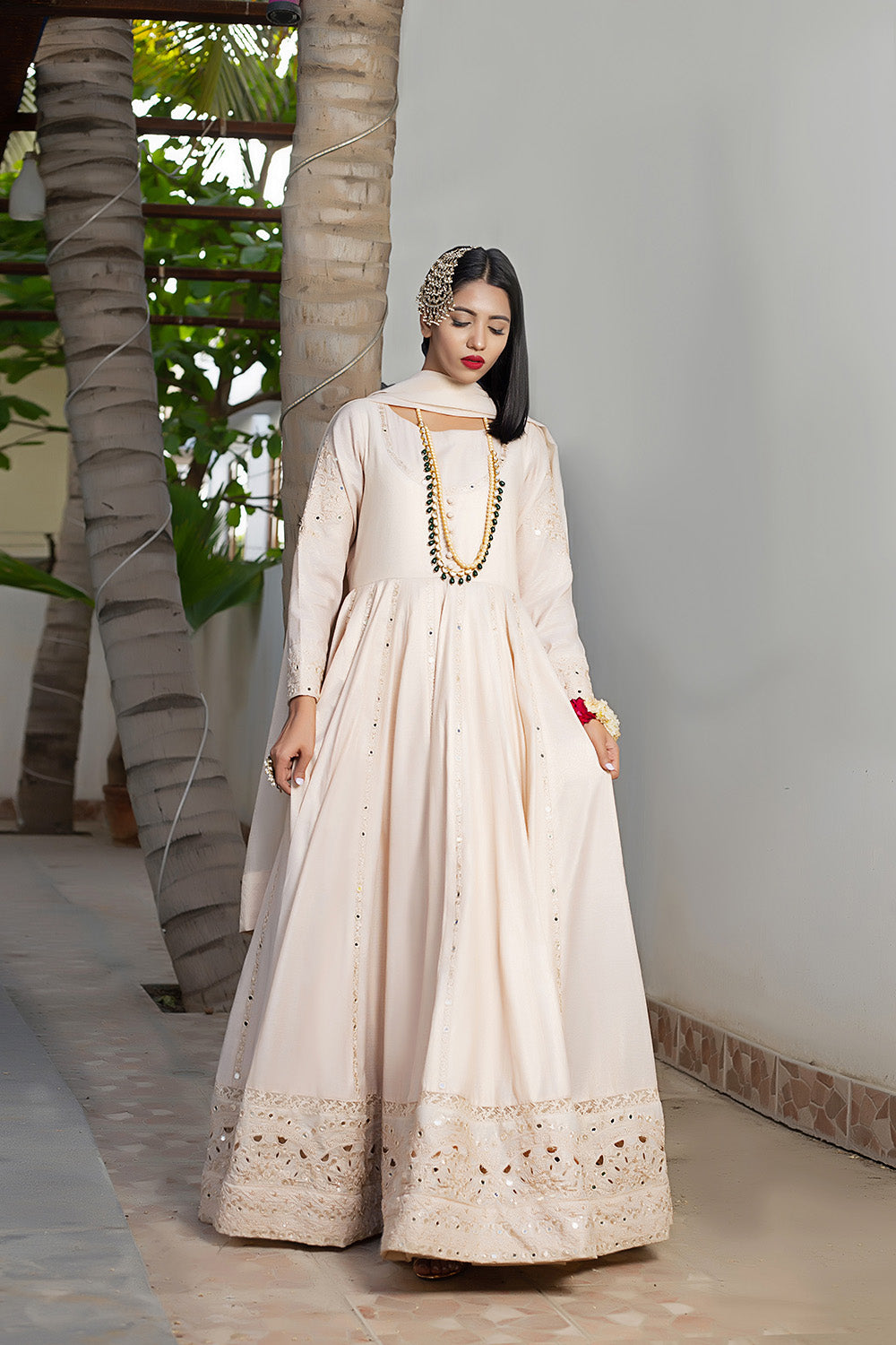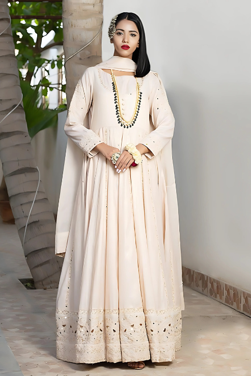 This off-white frock dazzles with all-over mirror work, framed by a delicately embroidered border and lace accents. Light, breezy, and full of festive charm, it’s made for moments that deserve to shine.