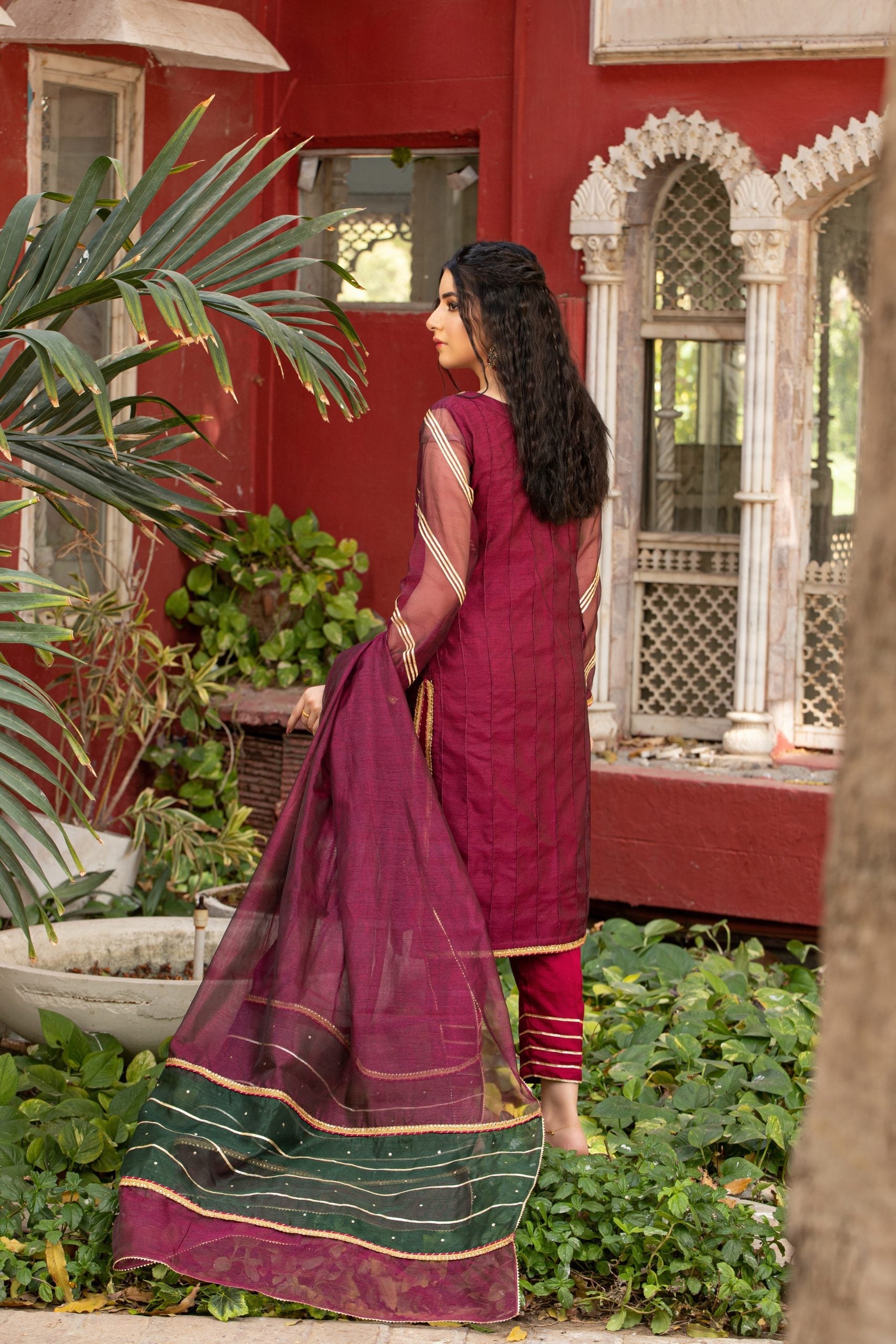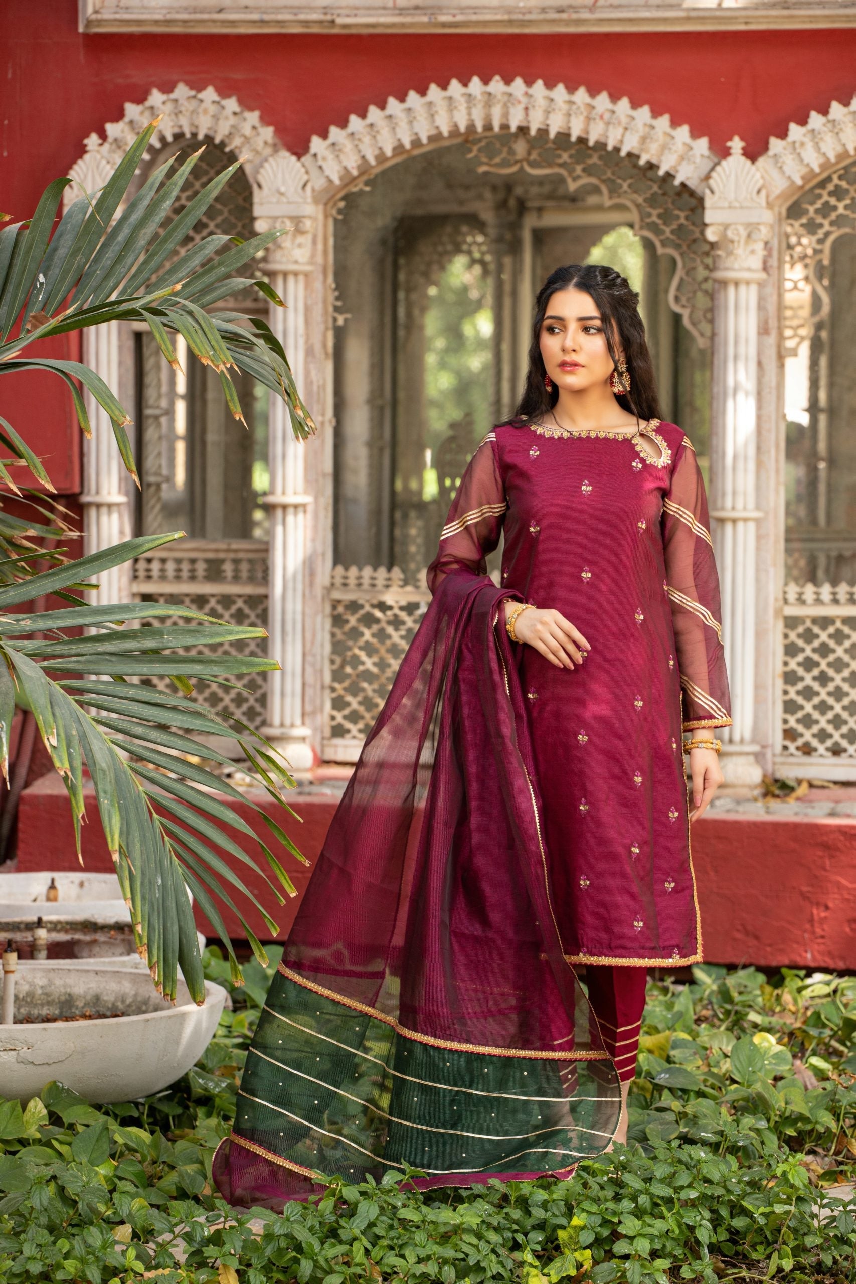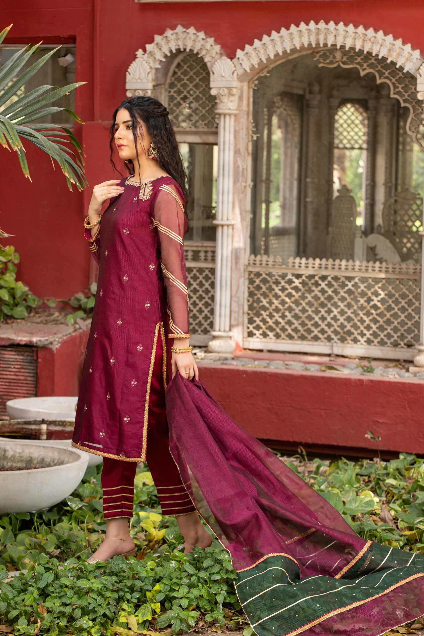 Guzel displays a vibrant combination of maroon and emerald green. The outfit is a 3-piece suit with Khaddi net shirt and dupatta. Whereas, the trousers are made in raw silk. Shirt has dabka, sitaara and color pearls embellishments on the front, gota and samosa lace on the sleeves and Indian lace on chalk and daaman. Dupatta has a two color contrast with sitara work on pallu, finished with samosa and gota laces. Trouser bottoms are also finished with gota laces.