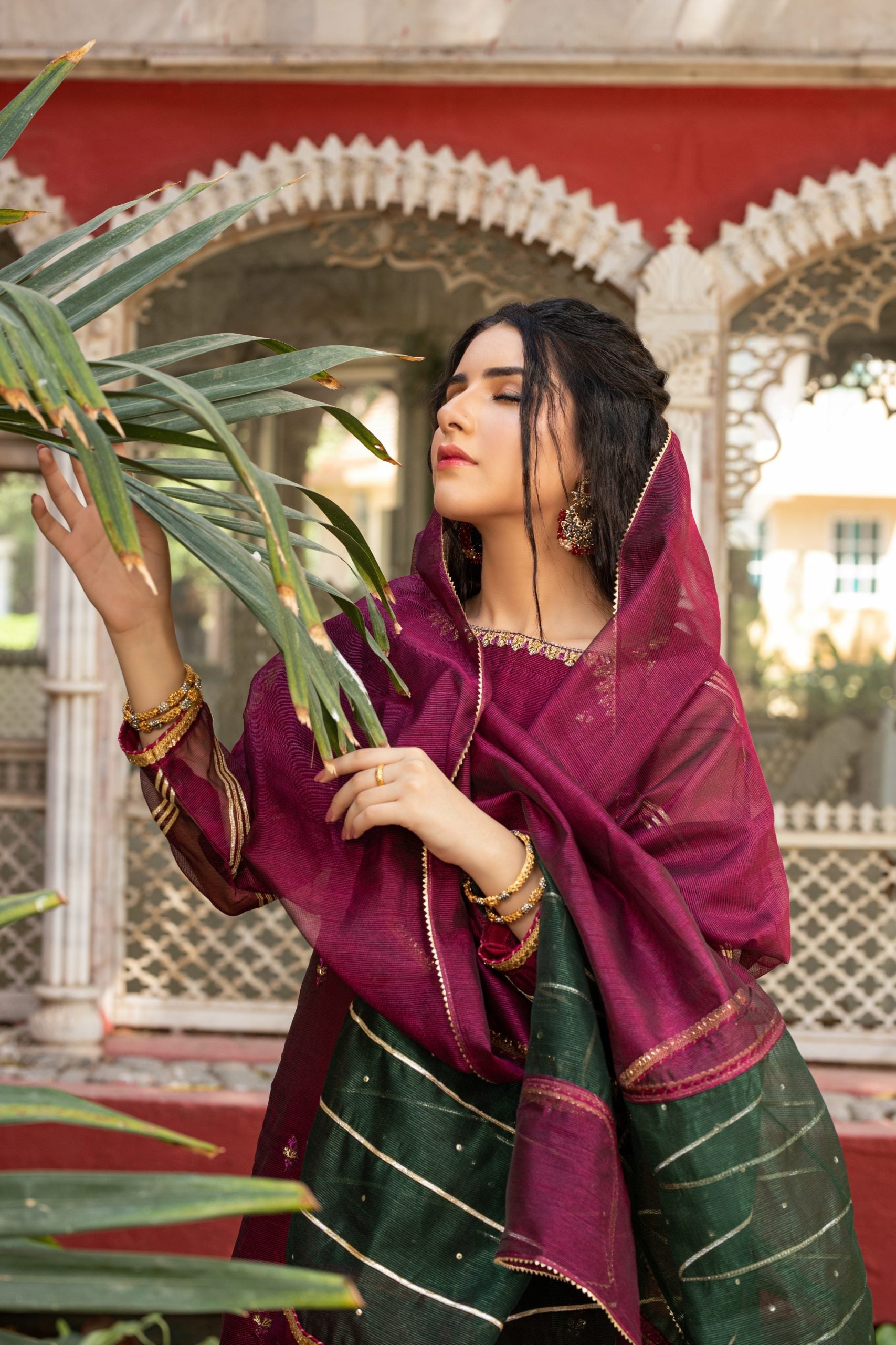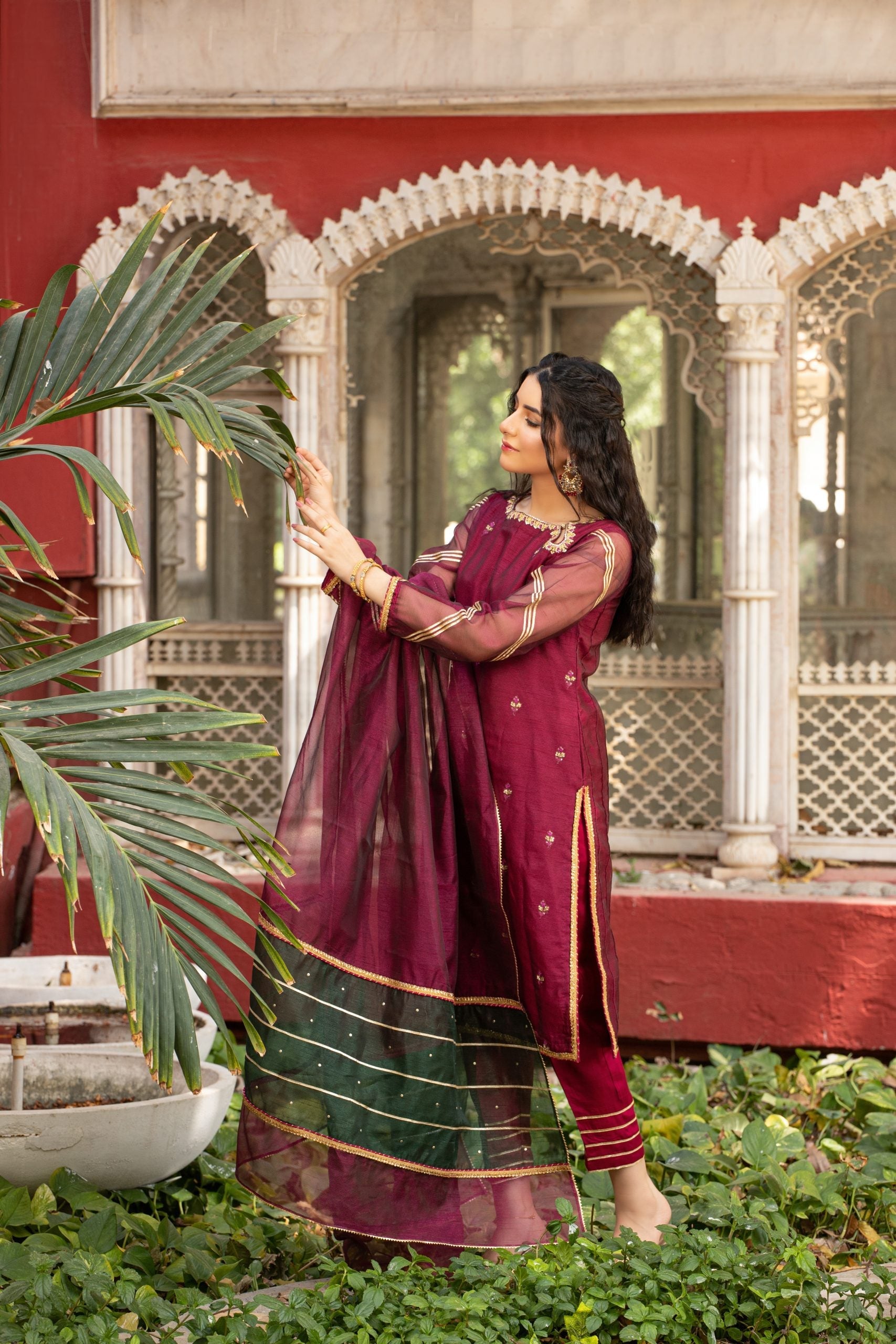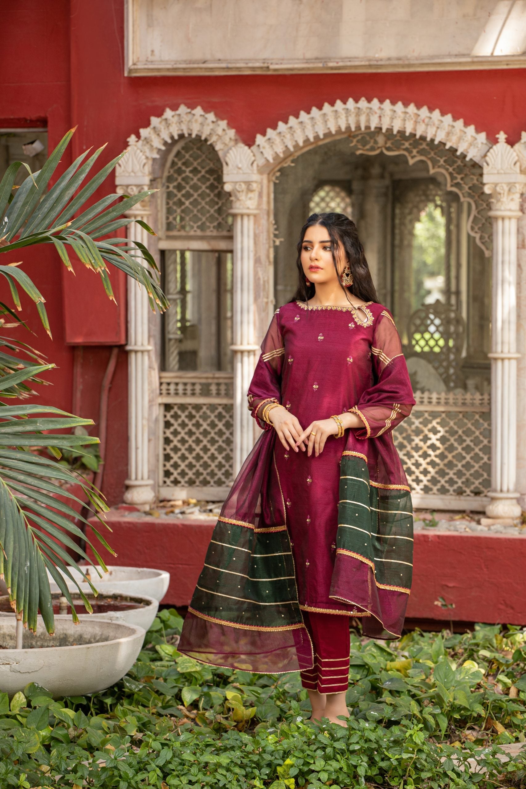 Guzel displays a vibrant combination of maroon and emerald green. The outfit is a 3-piece suit with Khaddi net shirt and dupatta. Whereas, the trousers are made in raw silk. Shirt has dabka, sitaara and color pearls embellishments on the front, gota and samosa lace on the sleeves and Indian lace on chalk and daaman. Dupatta has a two color contrast with sitara work on pallu, finished with samosa and gota laces. Trouser bottoms are also finished with gota laces.