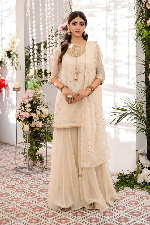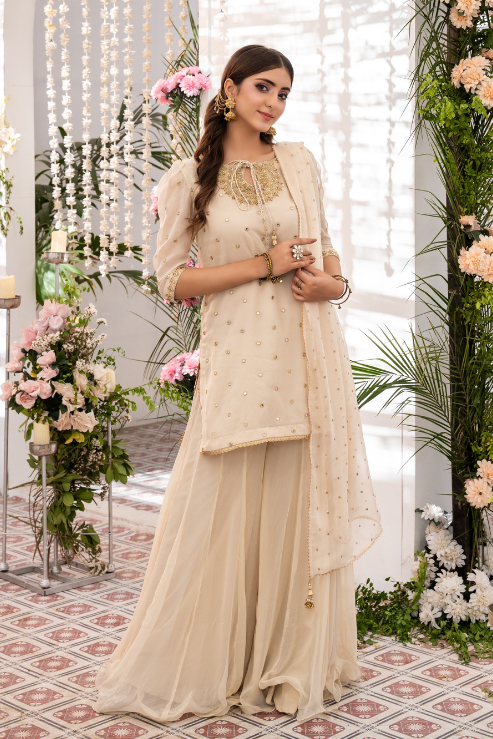 3-piece ensemble is a vision of timeless charm. The short shirt features radiant mirror work and handwork on the neckline, finished with kora and dabka detailing. Paired with a graceful Dhaka and a sequin-embroidered dupatta