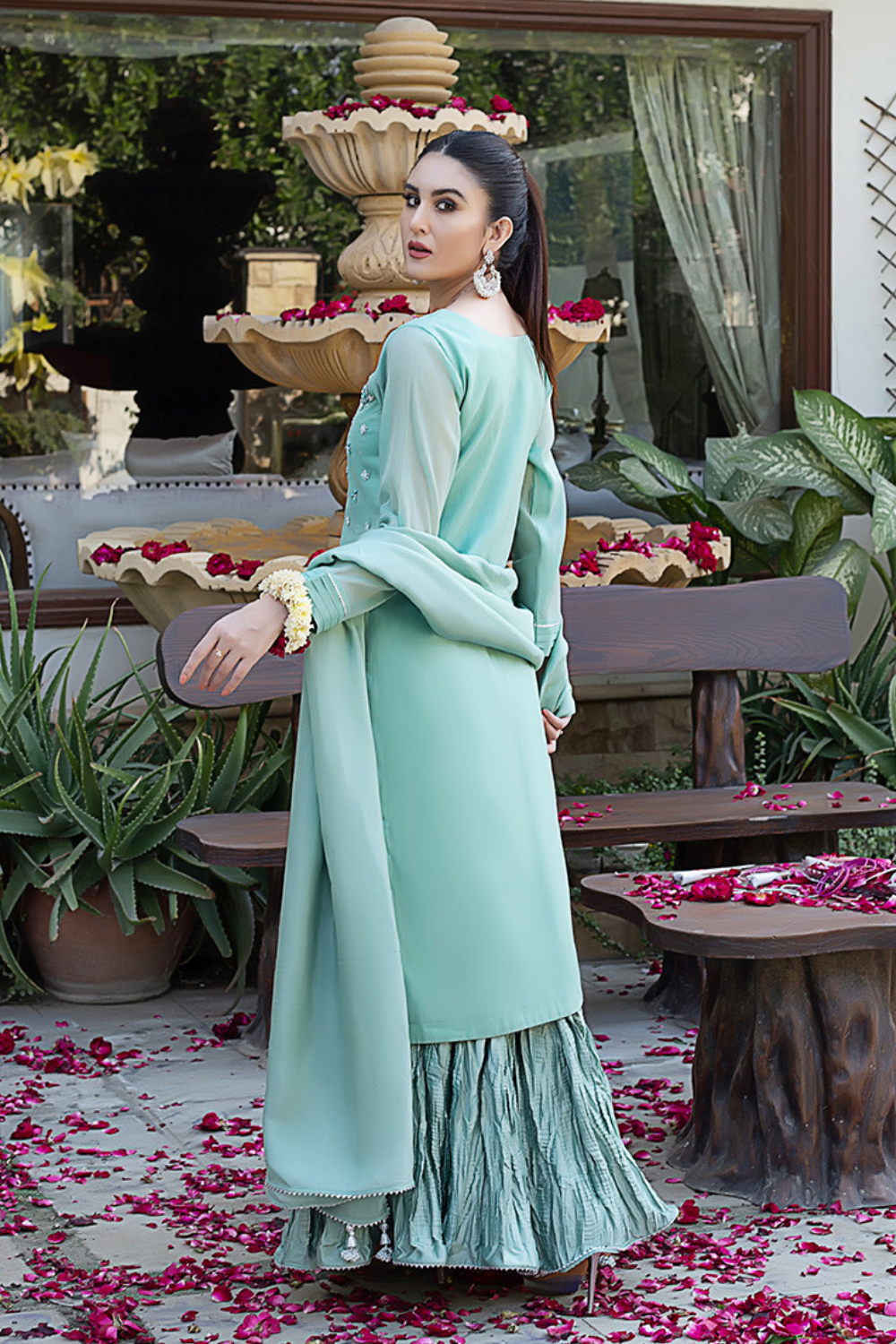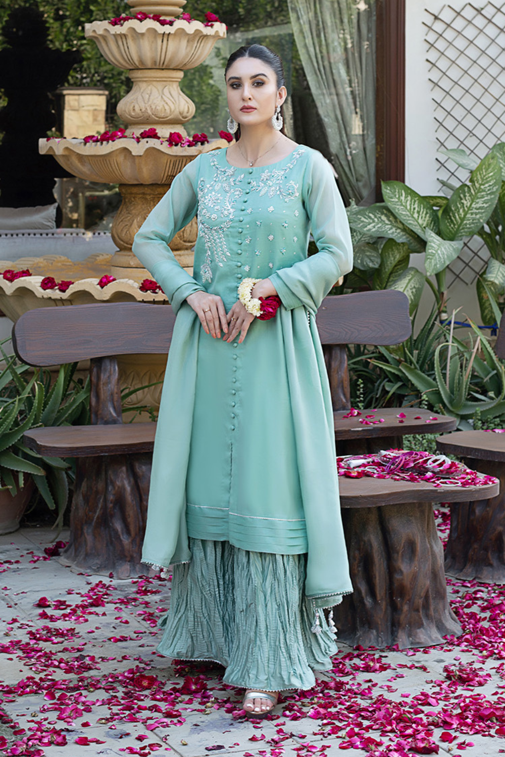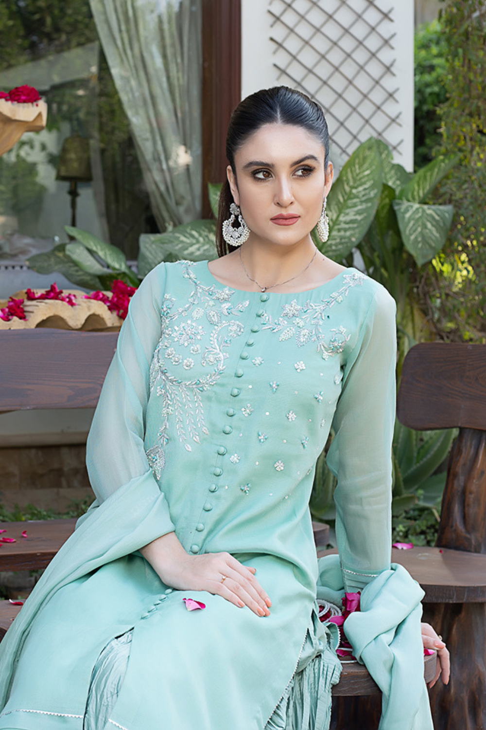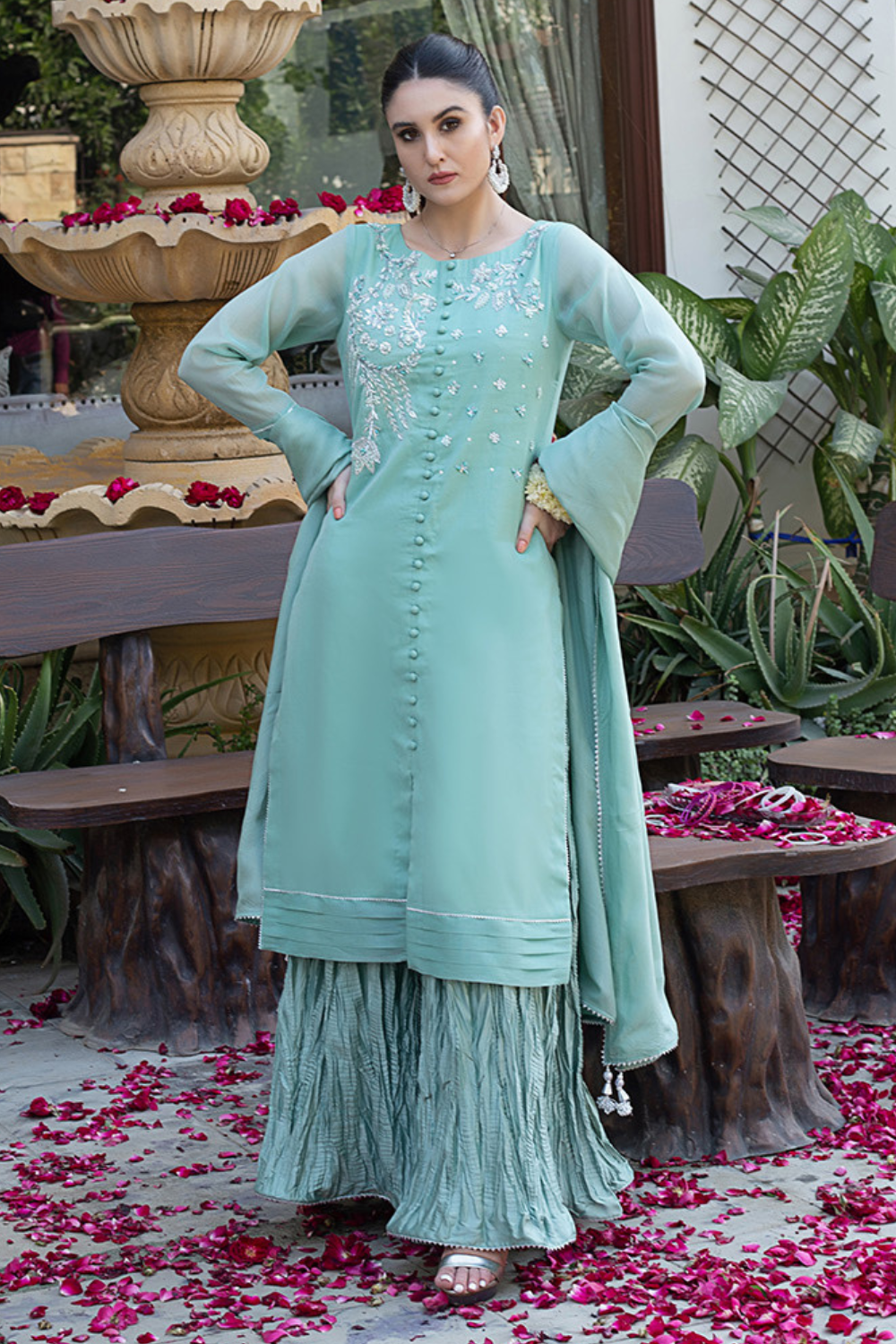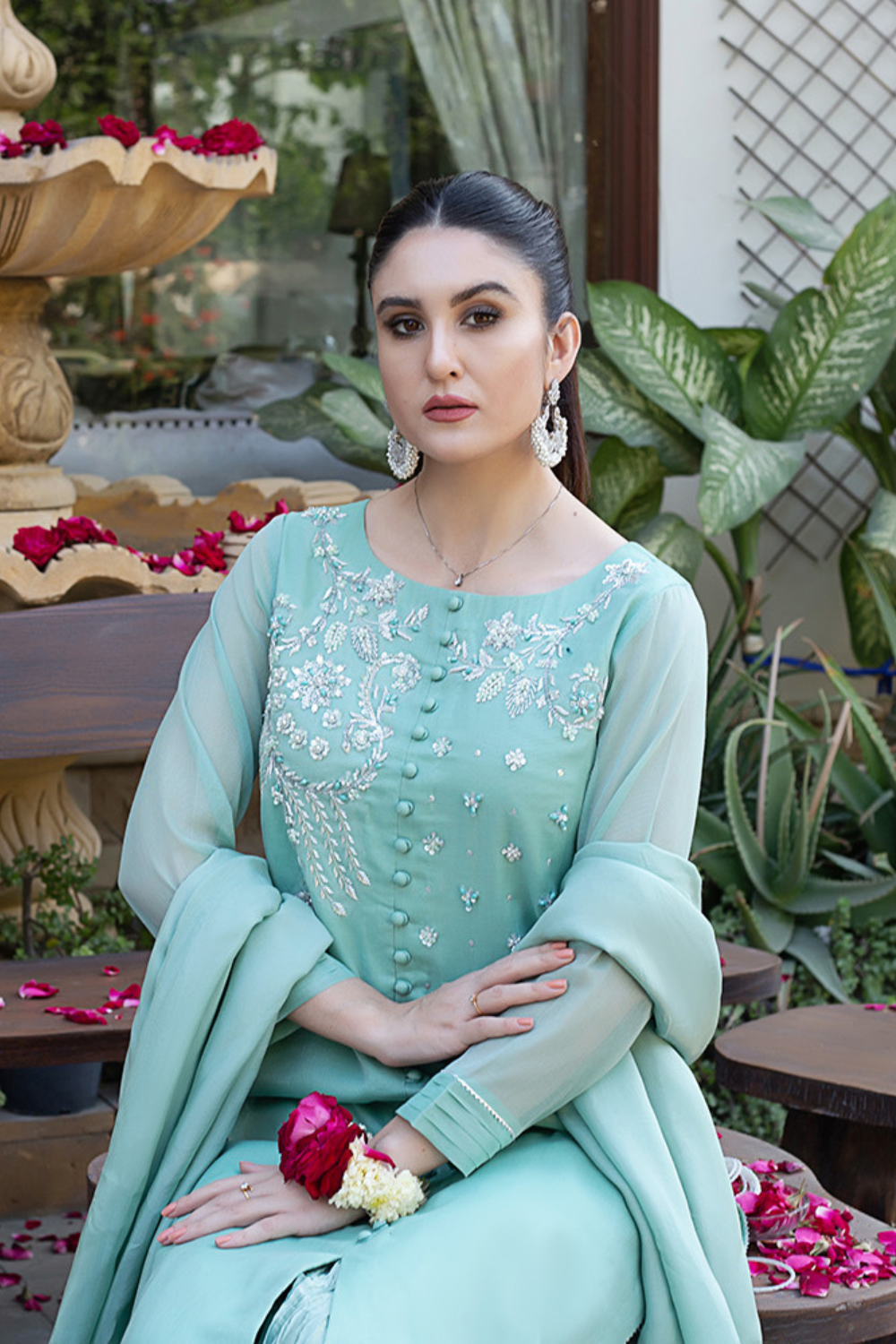 Introducing LEAH in Sky Blue - where tradition meets elegance. Adorned with intricate handwork including Cut Danas, Kora, and Dabca, LEAH embodies opulence. Paired with a Dhaka Trouser and a Silk Dupatta, it's a modern twist on timeless Pakistani attire.