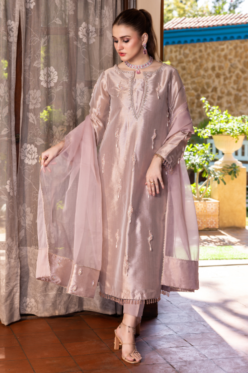 Mahnoor a dreamy tea pink ensemble crafted from luxurious lama fabric shirt, adorned with delicate handwork and pearls. Paired with a crystal raw silk trouser and an ethereal organza dupatta.