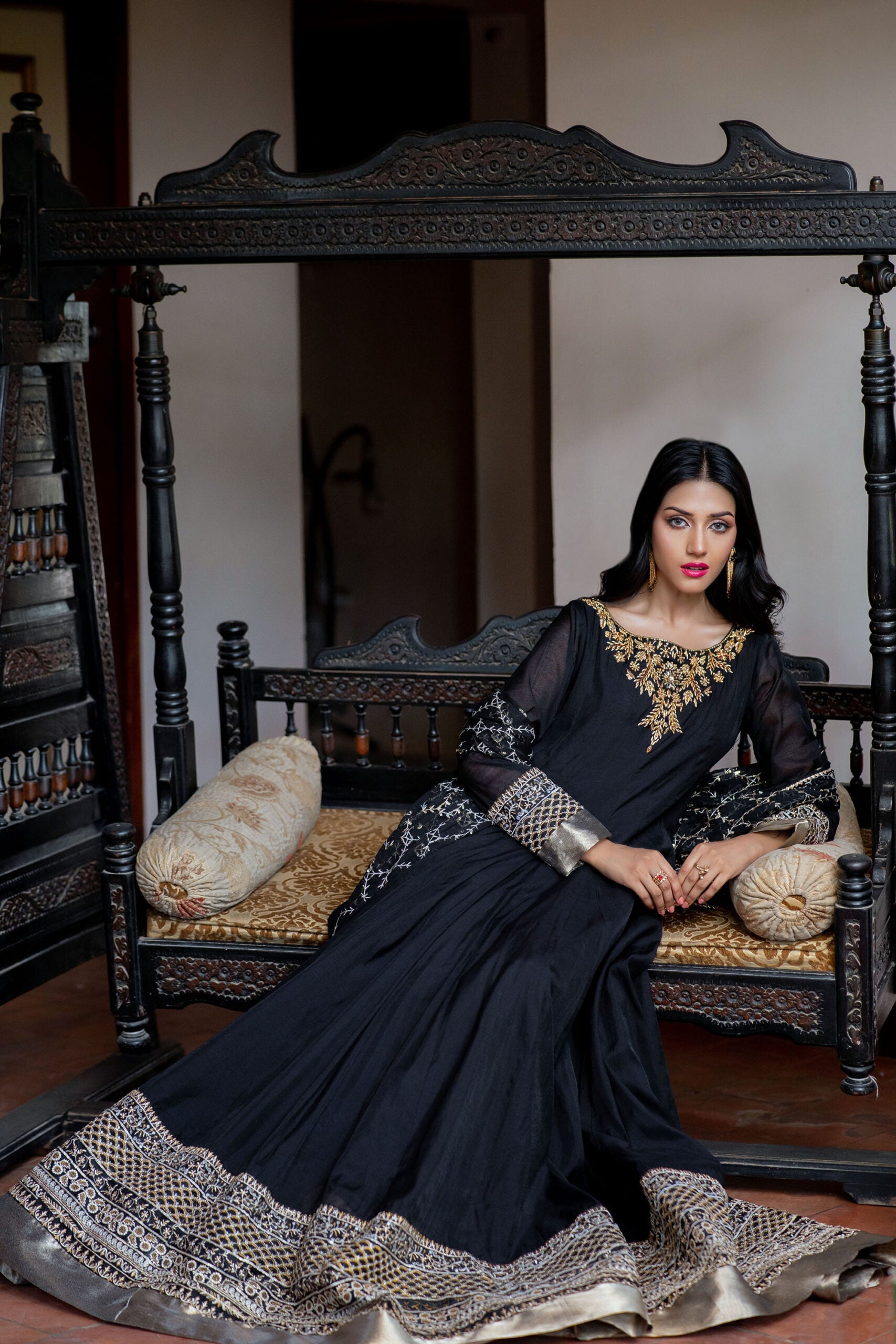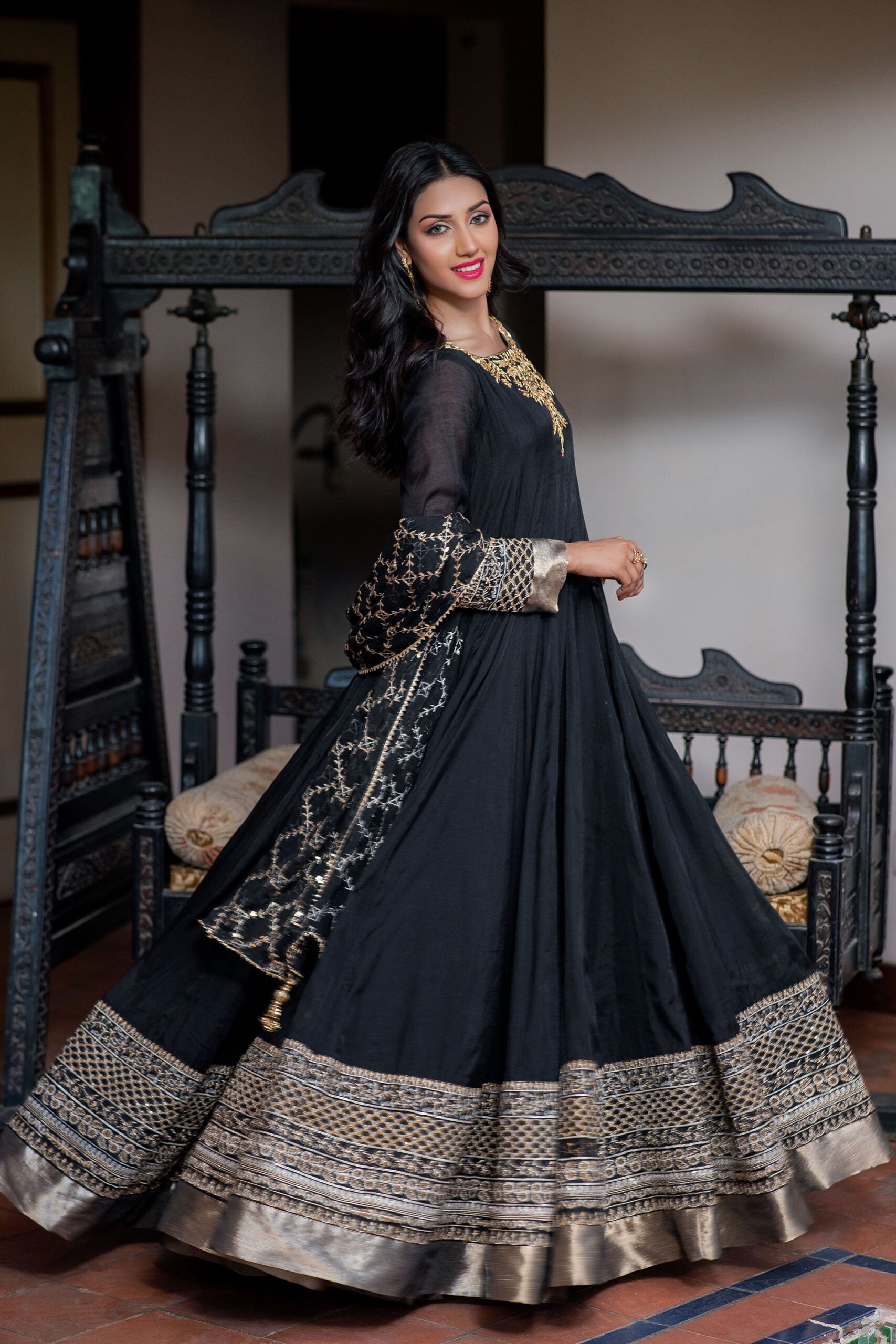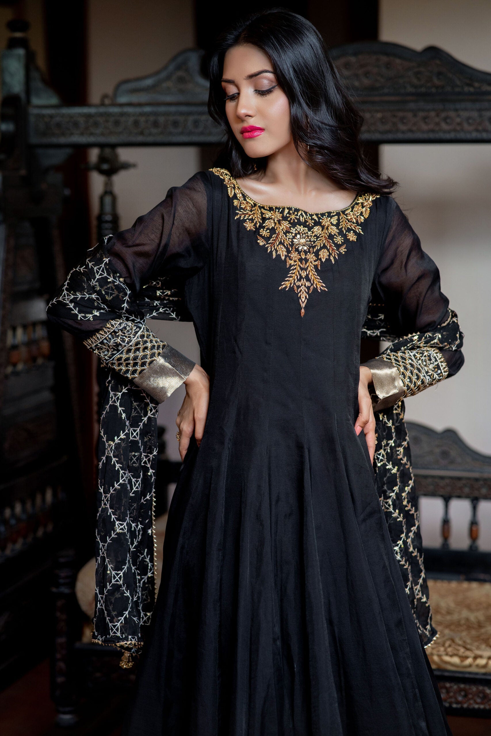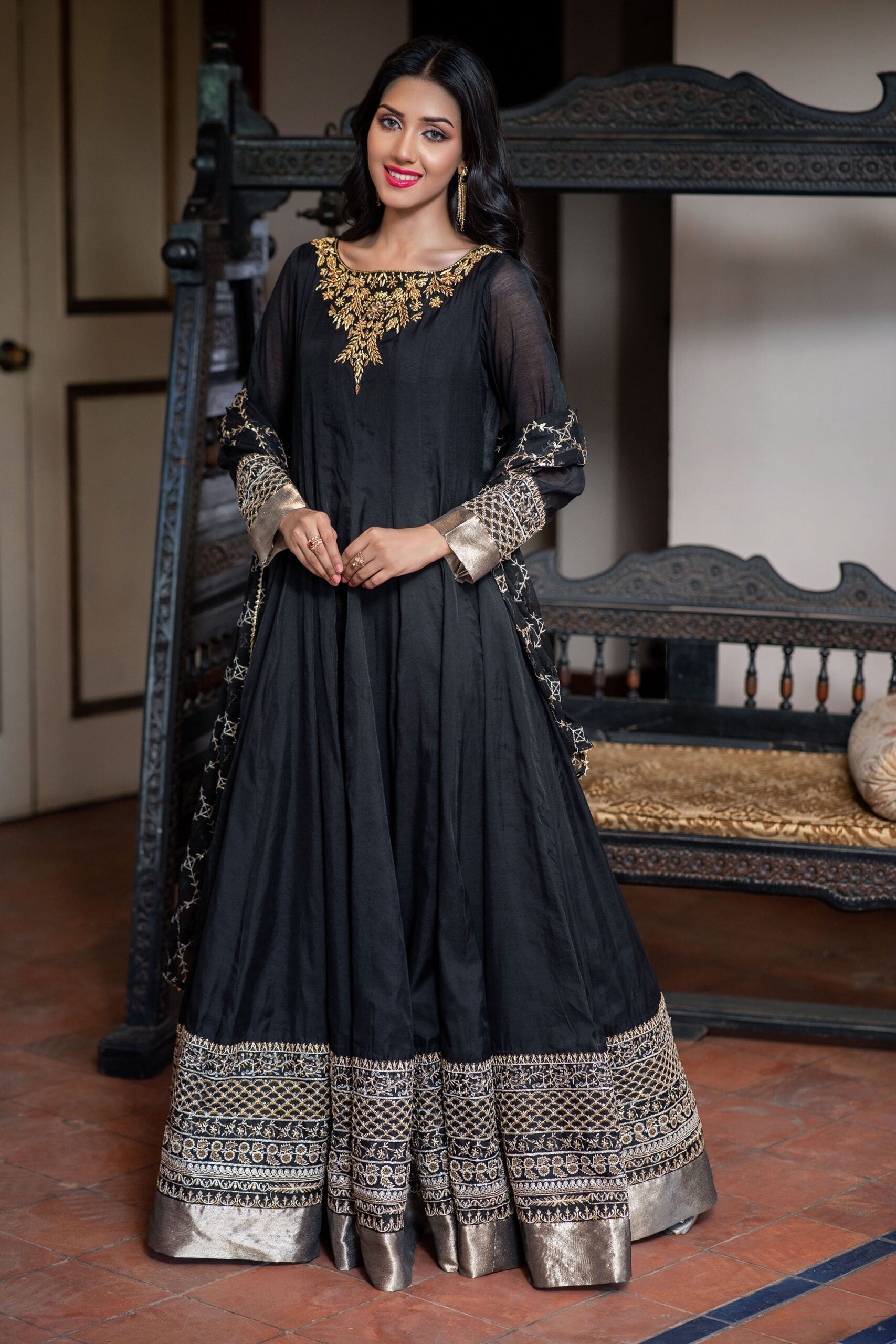 Introducing our exquisite 2-piece black paper cotton frock outfit! The front neckline features stunning handwork motives, while the sleeves and daaman are adorned with an embroidered panel and lama fabric, adding a touch of elegance. Complete the look with our matching chiffon dupatta, featuring a beautiful embroidered panel. Perfect for your special occasions!