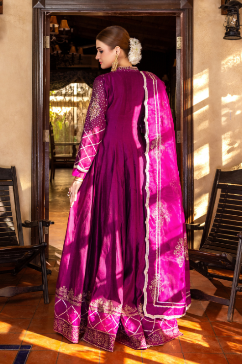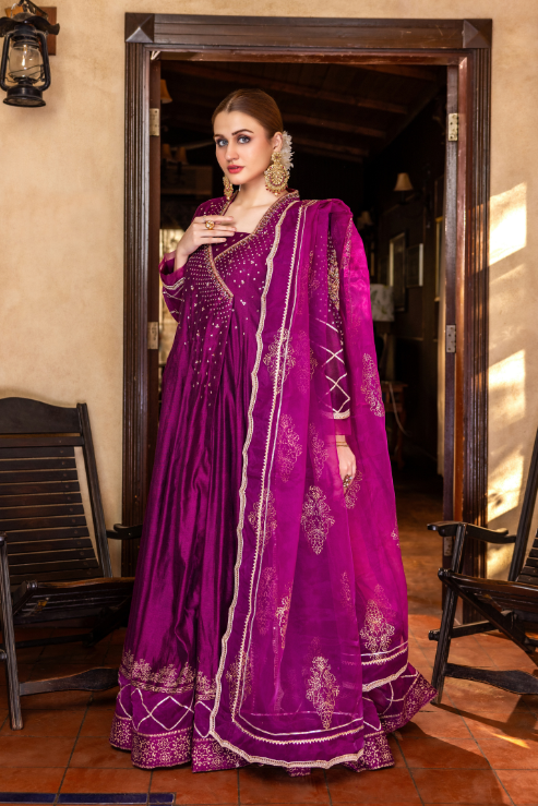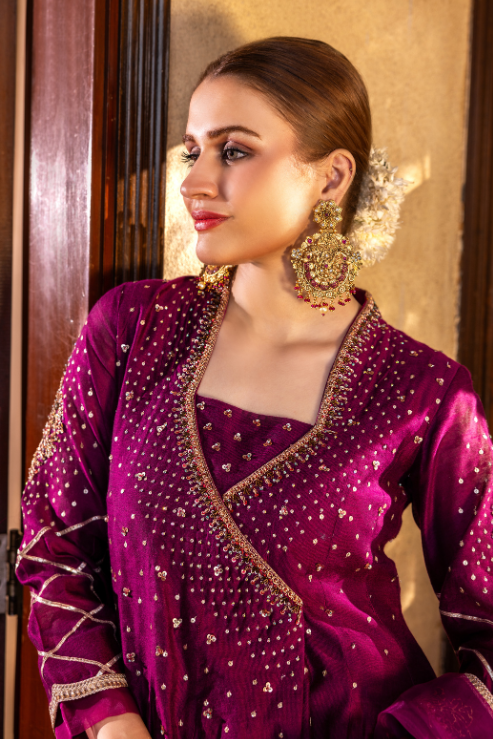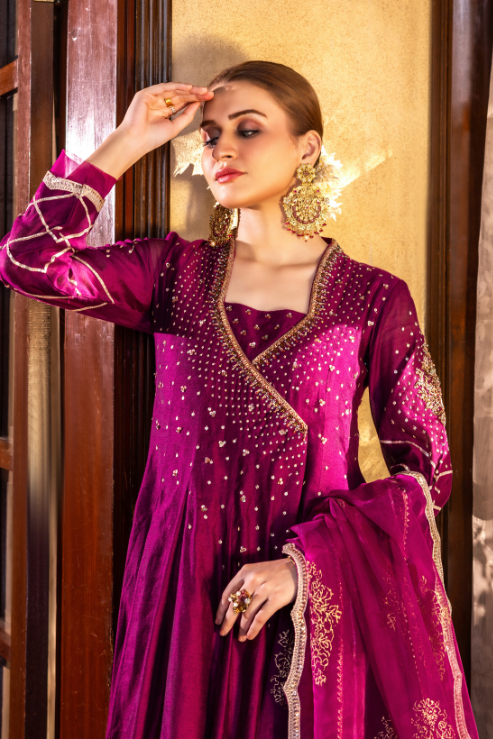 A magenta Angrakha frock in luxurious khadi silk, adorned with intricate handwork featuring kora, dabka, sitara, and pearls. Paired with raw silk straight pants and an organza dupatta with block print and lace, it’s a look crafted for celebrations!