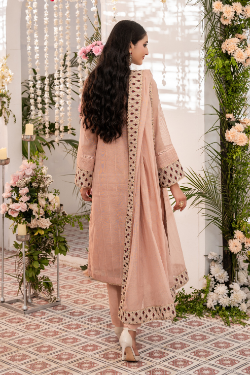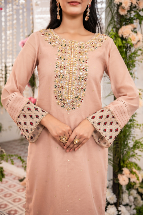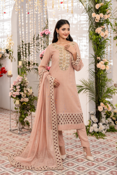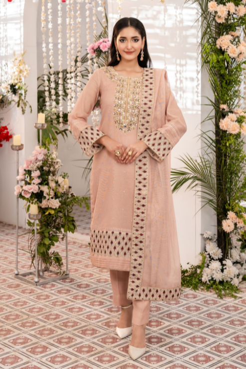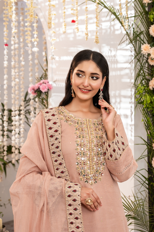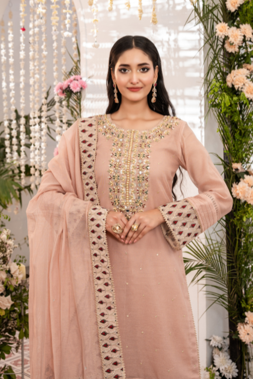 Introducing Mashal in an elegant tea pink hue — where handworked mirrors and pearls light up the neckline, and delicate embroidery graces every border and cuff. Paired with classic raw silk pants and a finely finished khaddi net dupatta,