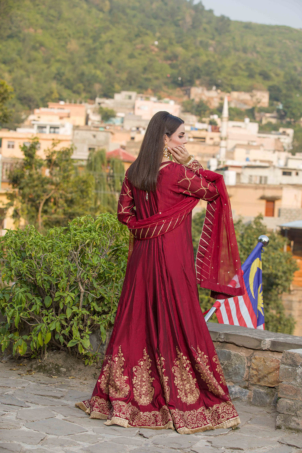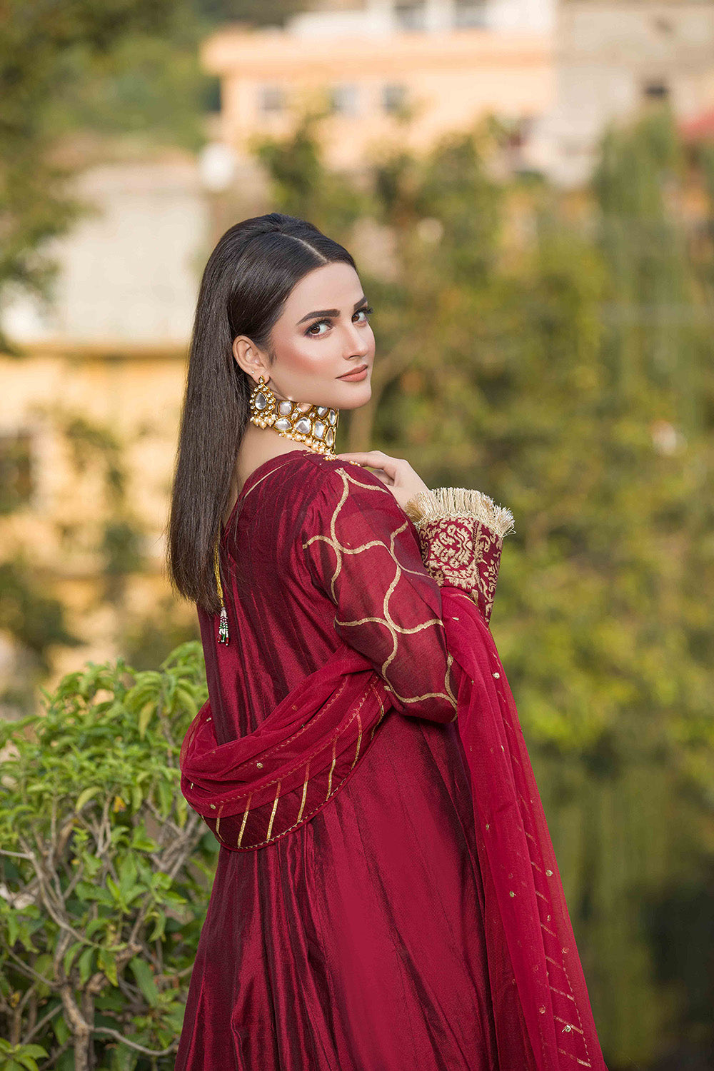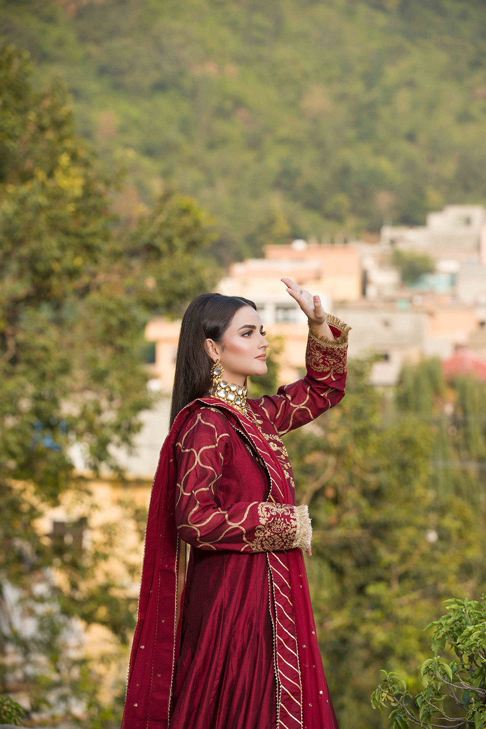 Introducing our elegant maroon paper cotton frock, adorned with exquisite handwork detailing on the front and intricate handwork at the wrist of the sleeves. The sleeves are beautifully accented with fine gota work and delicate Indian lace. The hem of the frock features charming embroidered bunches, adorned with exquisite embroidery lace and Indian lace for an extra touch of grace. To complete this captivating ensemble, we've included a net dupatta adorned with sitara embellishments and a tasteful gota lace border.