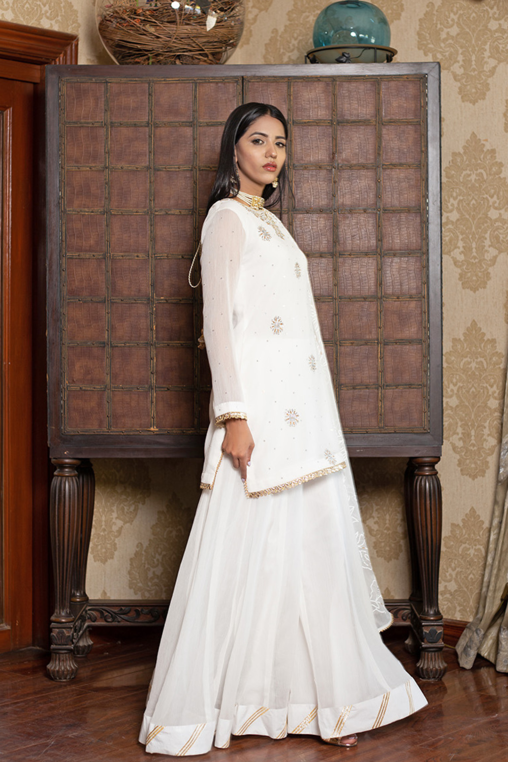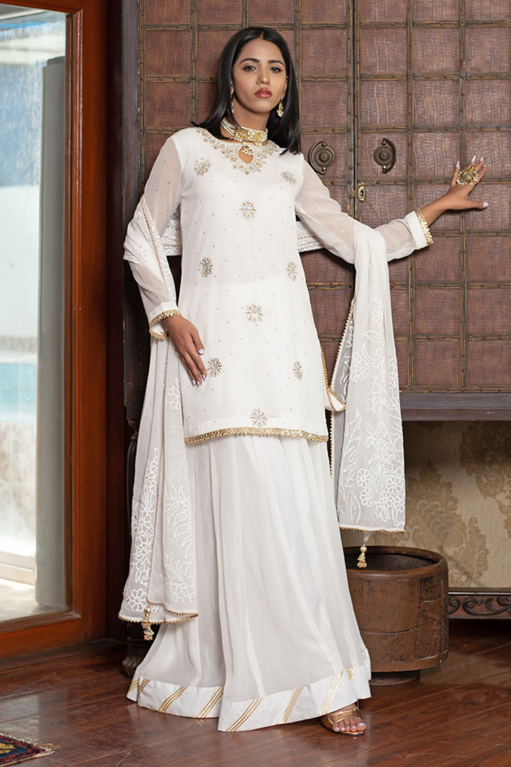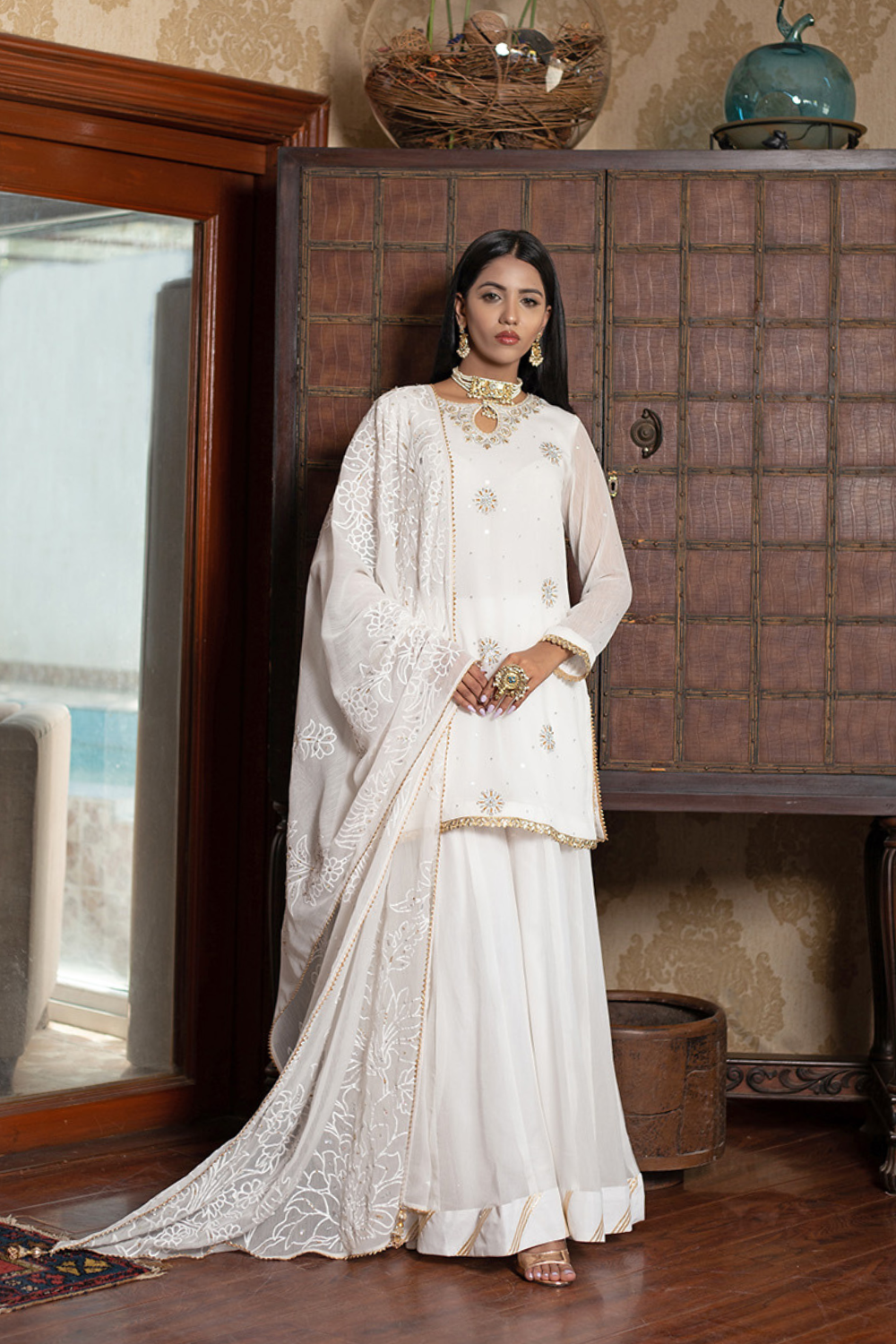 In a pristine shade of white, the MEHR ensemble exudes purity and sophistication, making it a captivating choice for any special occasion. The crinkle chiffon shirt drapes gracefully, while the accompanying dhaka trouser and dupatta add layers of grace and charm.