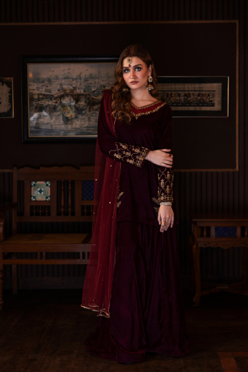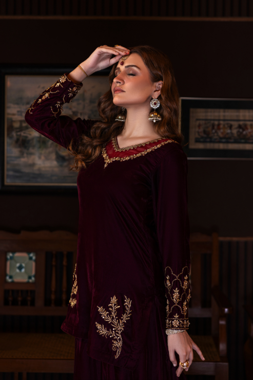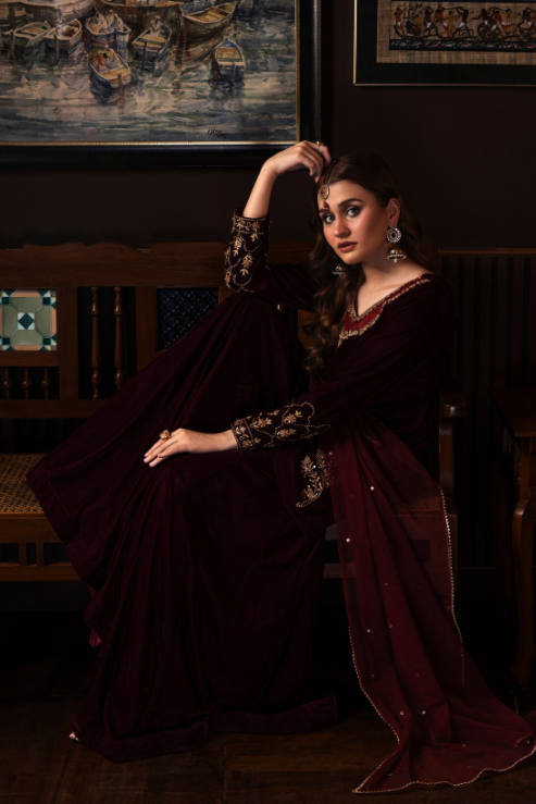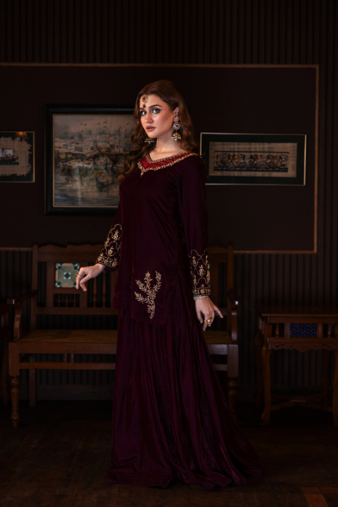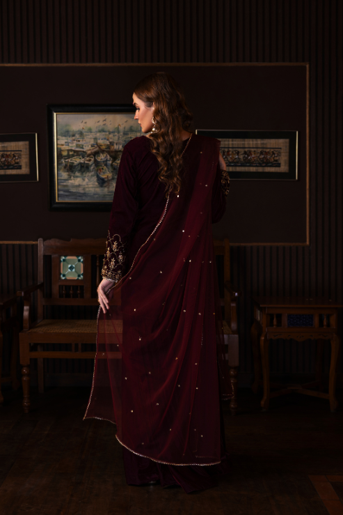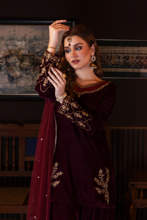 Drape yourself in the timeless elegance of Mehrlux, where opulence meets tradition. The maroon velvet short shirt is adorned with golden handwork featuring kora, dabka, sitara, and stones, paired with a classic Dhaka pajama. Complete the look with a delicate chan-detailed dupatta for that effortless festive charm.