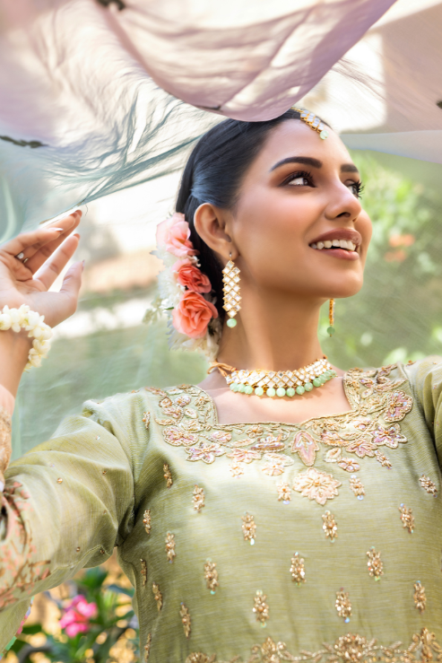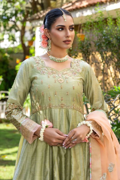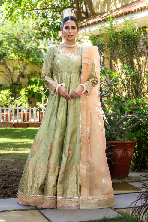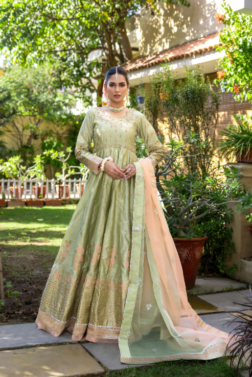 Drape yourself in the enchanting charm of Musfirah, where khaddi silk meets intricate craftsmanship. The handworked maxi, adorned with kora, dabka, resham, and sequins, flows into a block-printed embroidered border. Paired with a dreamy two-tone organza dupatta, this look is pure magic!