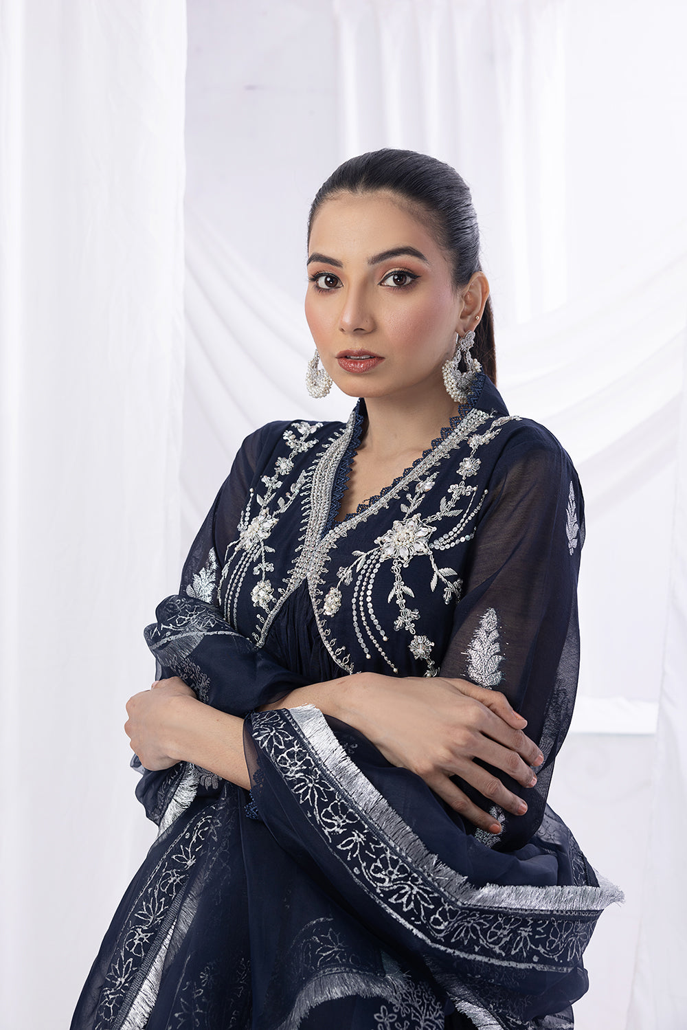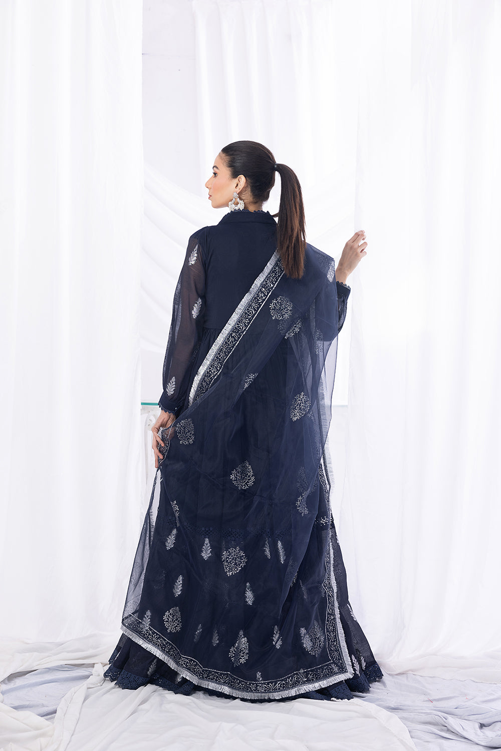 Step into sheer grace with our Blue Paper Cotton Overlap Frock. The embroidered body adds a touch of charm, while the self-organza fabric gracefully flows through the sleeves and daaman. The dupatta, crafted from the same self-organza fabric, is adorned with Indian lace, completing the ensemble with a delicate finish.