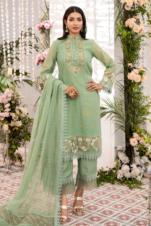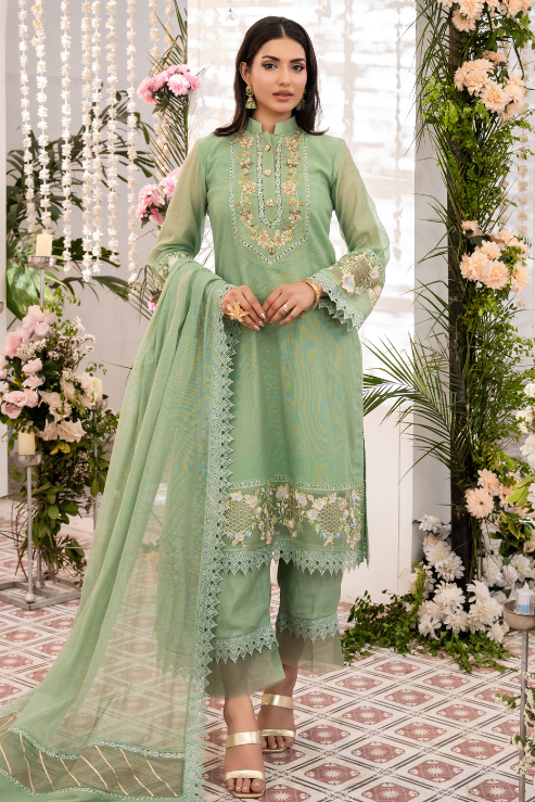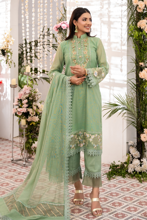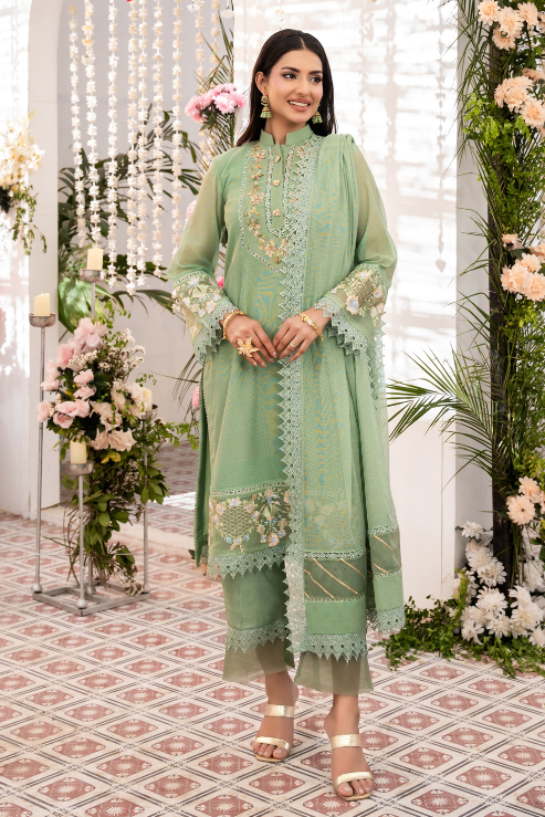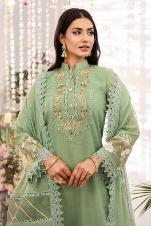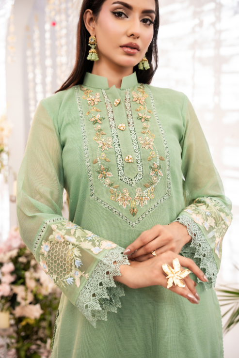 A pista green dream crafted on khaddi net with delicate handwork on the neckline and embroidery that whispers sophistication. Finished with lace-trimmed details and paired with straight raw silk pants and an ethereal organza dupatta, this look blends tradition with quiet luxury.