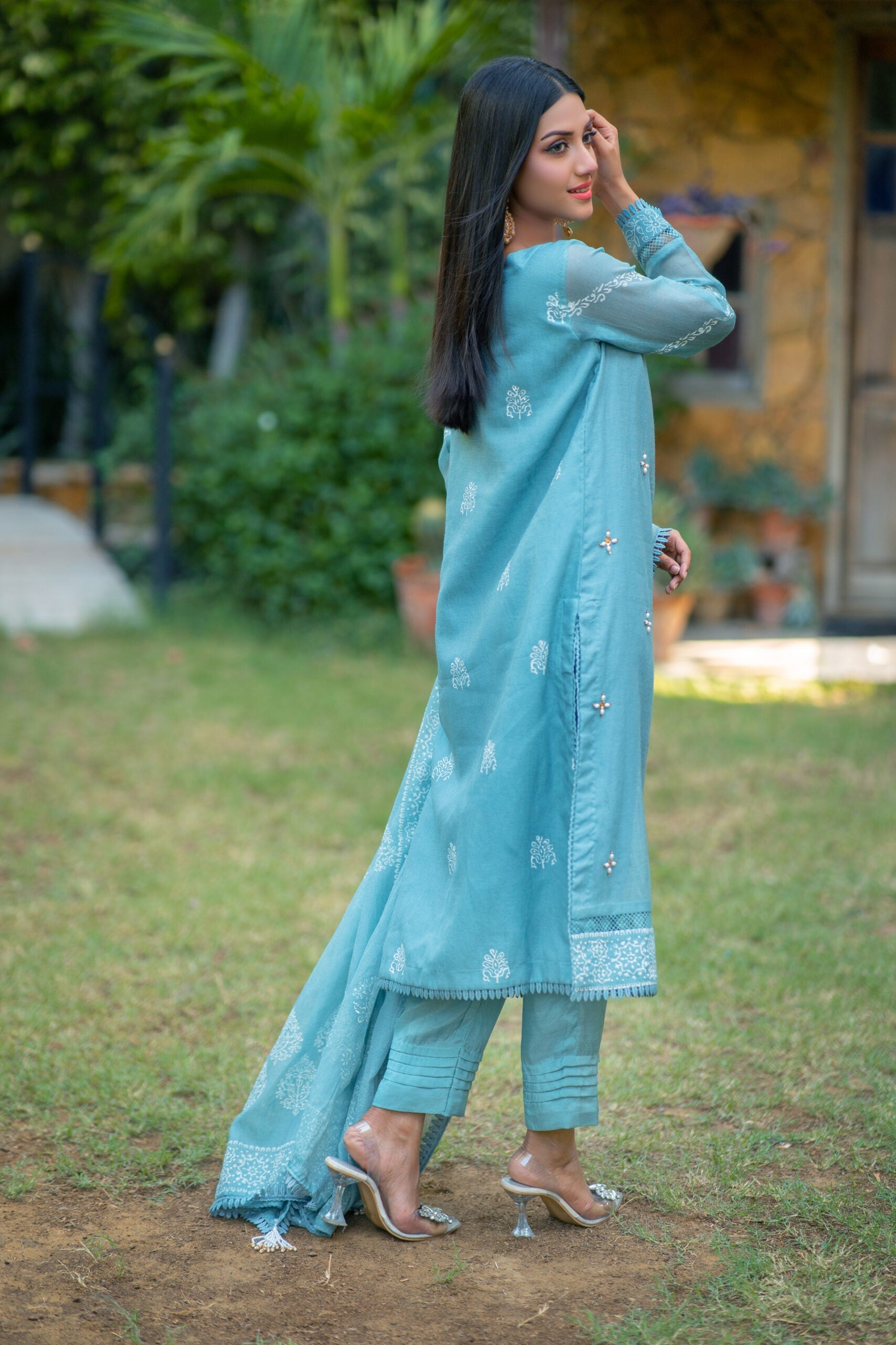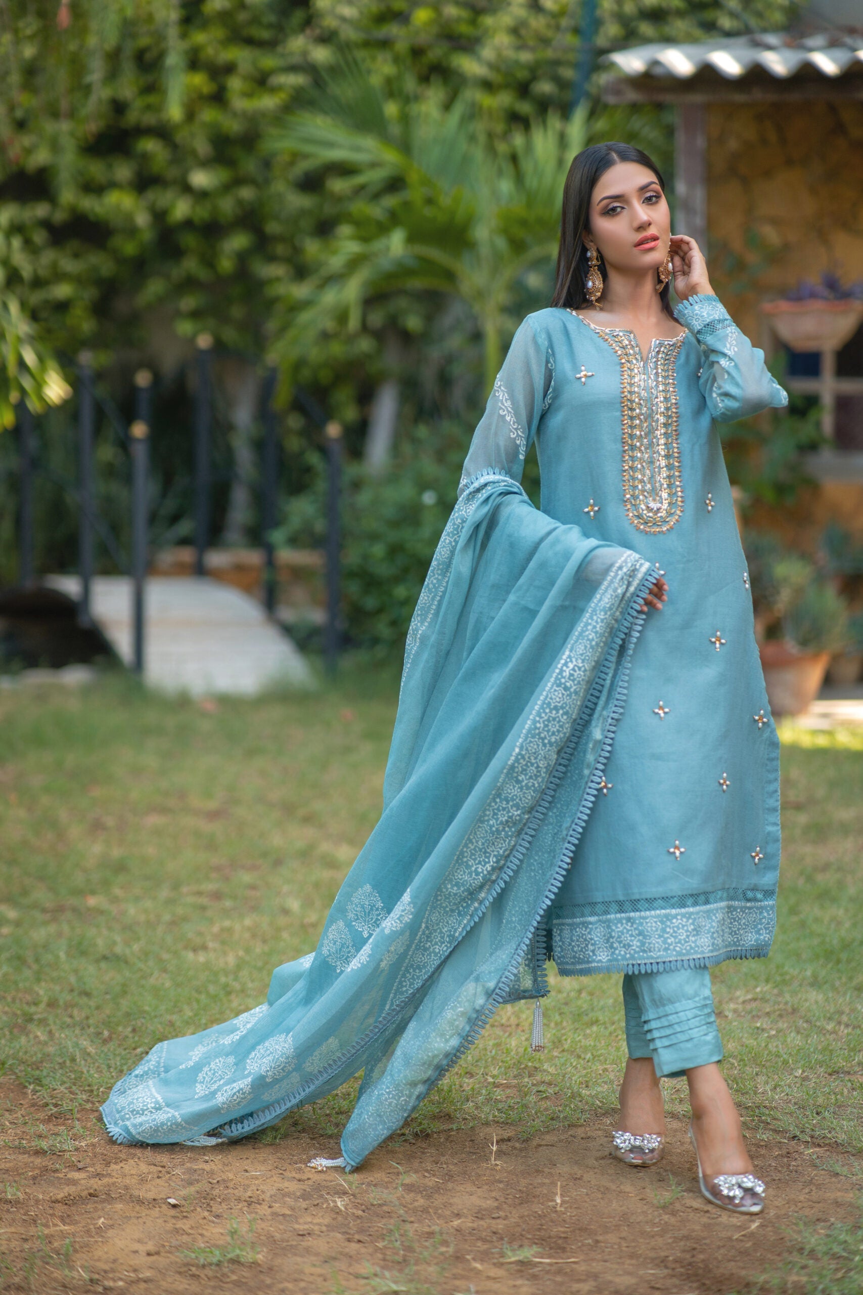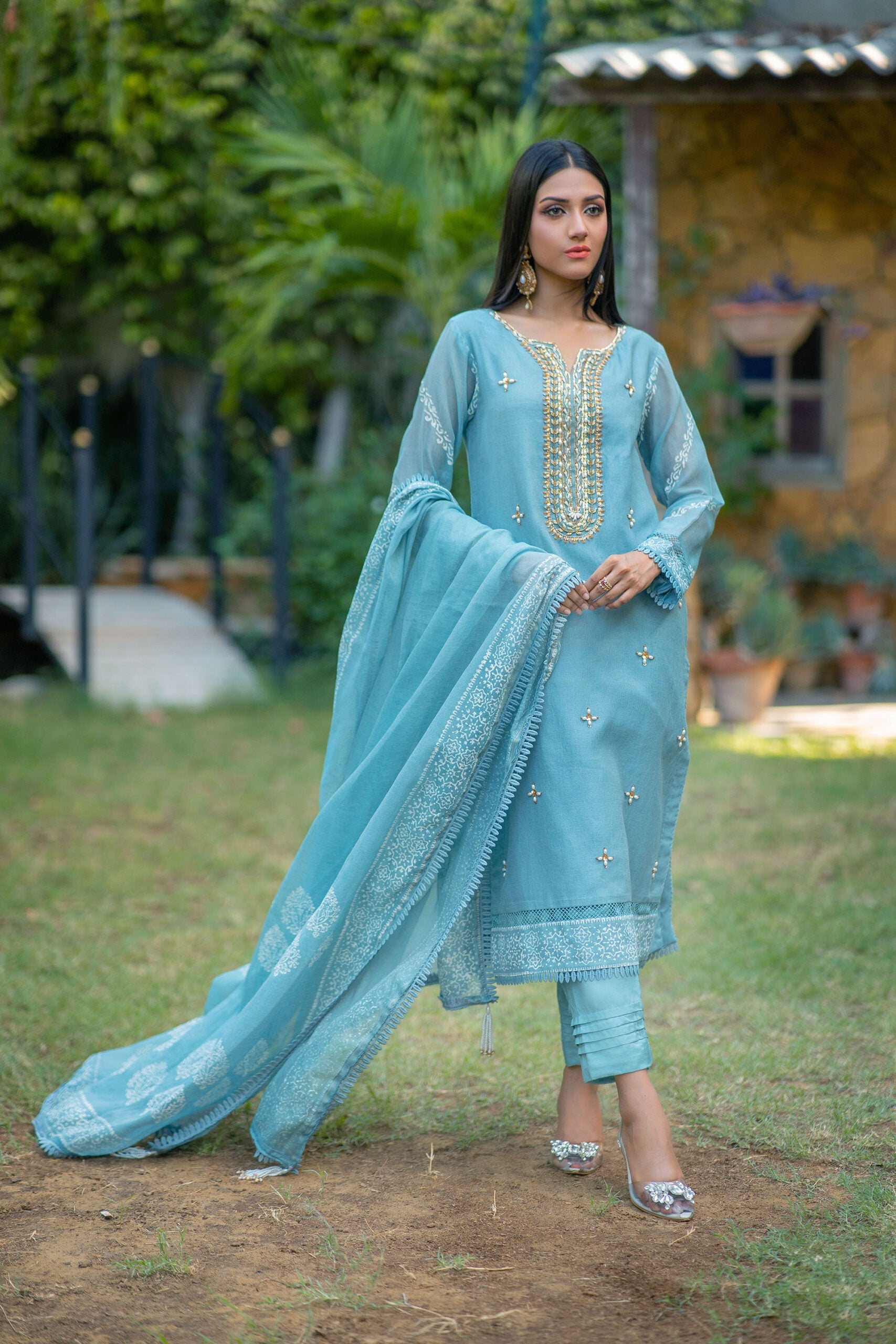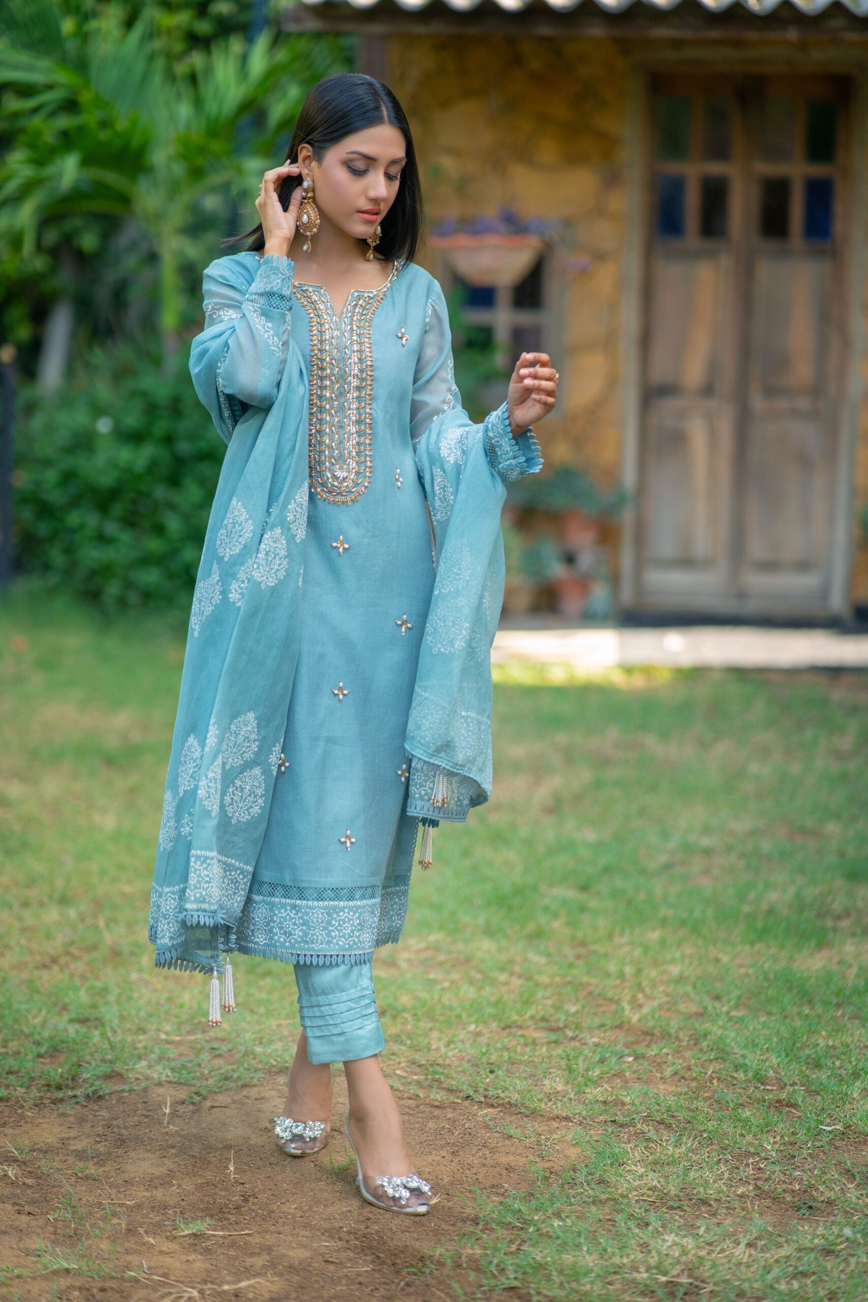 Crafted with delicate Khaddi net fabric for an elegant drape. The shirt and dupatta dazzle with intricate dabka, ticki stones, and lustrous pearls on the neck and front panel. Contemporary blockprint work adorns the sleeves and dupatta, while shiffli lace adds an enchanting touch to the daaman, sleeves, and dupatta. Complete with pearl tassels, this ensemble showcases exceptional craftsmanship and attention to detail. The trousers, tailored from luxurious raw silk, add a regal sophistication. Elevate your style with this resplendent creation, a timeless symbol of refined beauty.