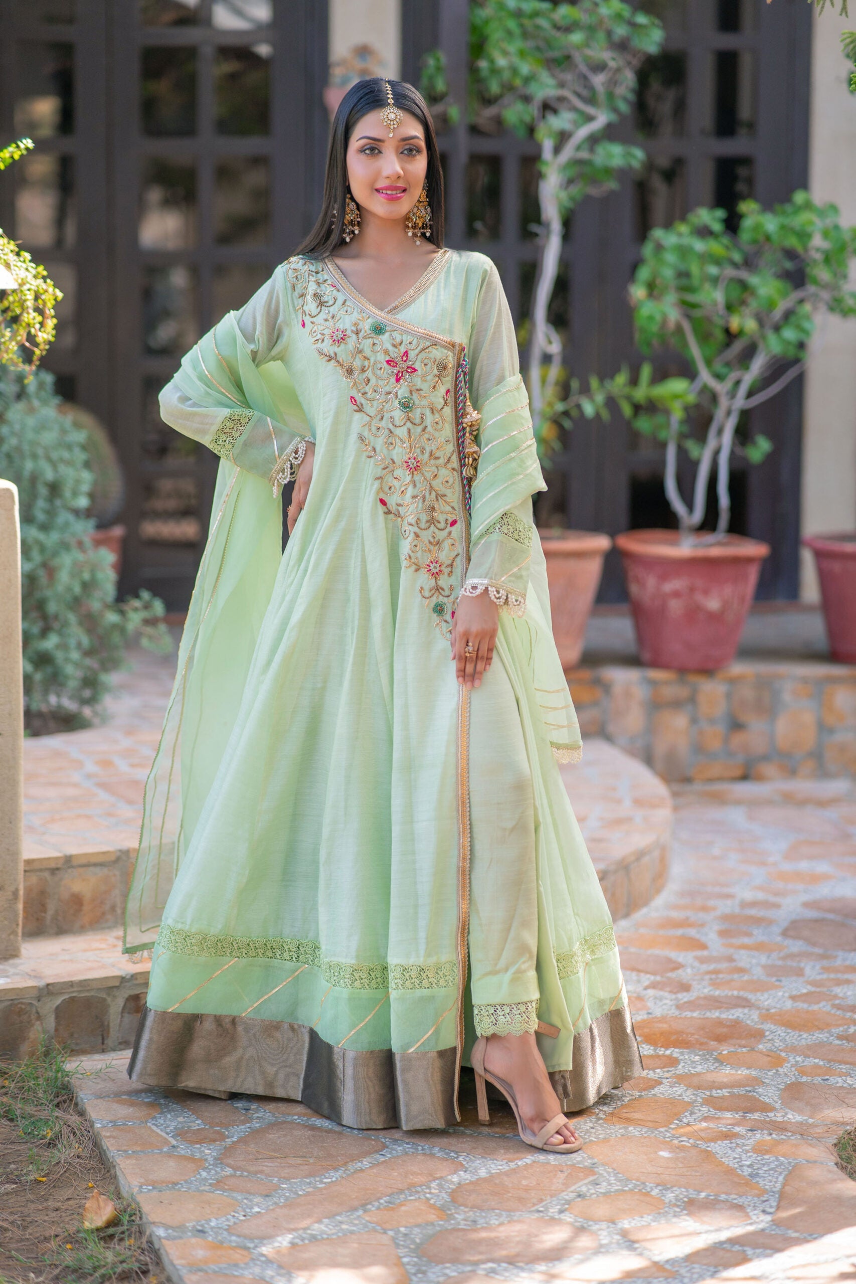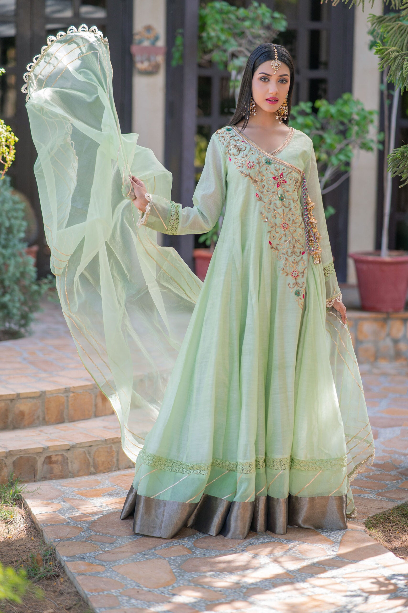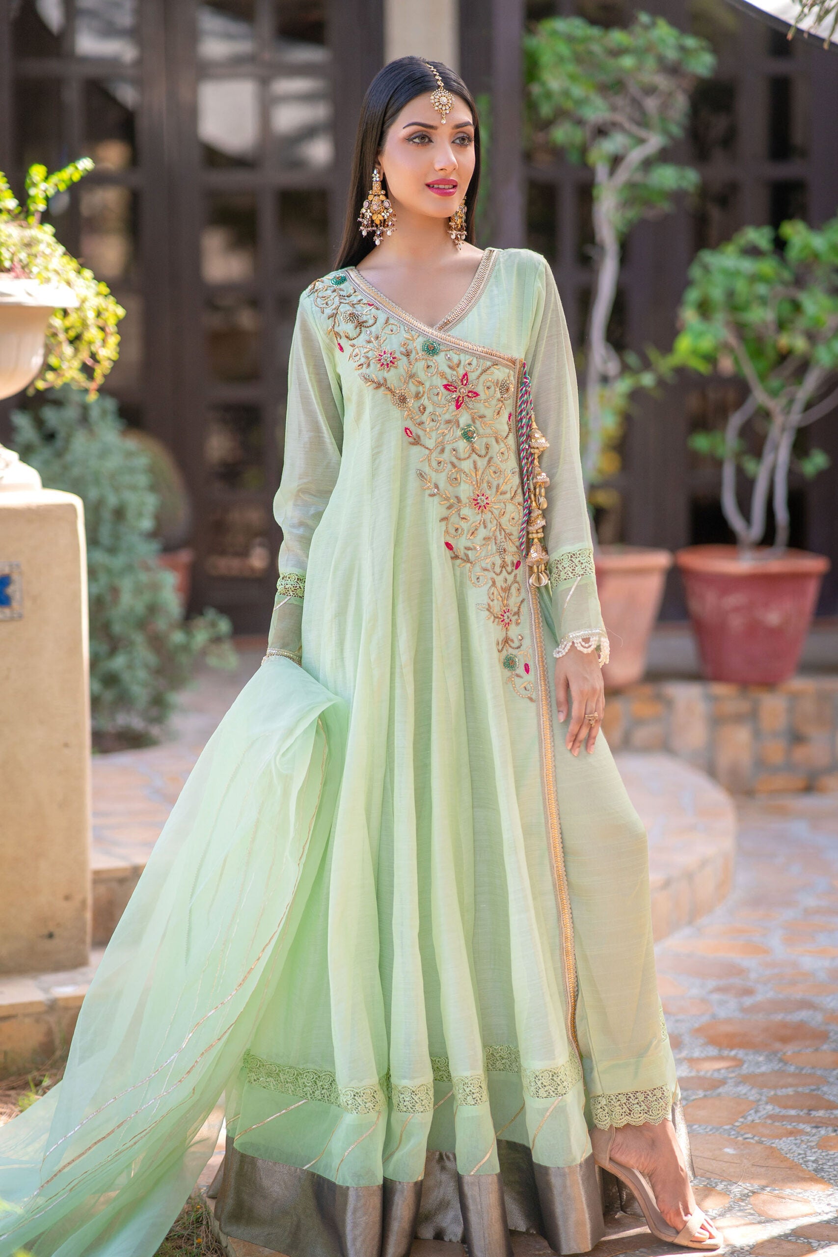 Introducing our exquisite Mint Green Paper Cotton Anrakha 3-Piece Frock. The frock features a beautifully handcrafted front neckline motif, adding a touch of intricate charm. The sleeves and daaman are adorned with delicate shiffli and gota laces, while the sleeve hem is finished with a subtle pearl lace for a graceful look. To enhance its beauty, we have added attached tassels with a dori on the front. The trouser is made with raw silk fabric, providing a comfortable and chic fit. The dupatta, crafted from organza fabric, is elegantly finished with gota laces, complementing the overall ensemble. Step into the world of timeless elegance with this enchanting piece.