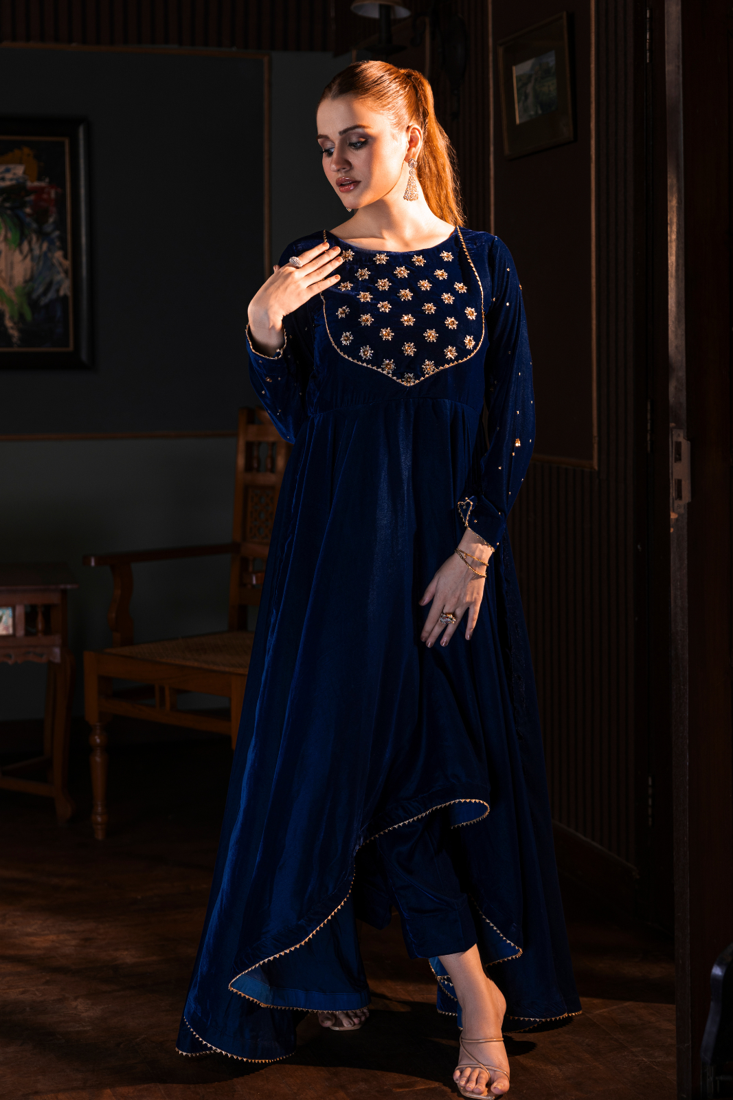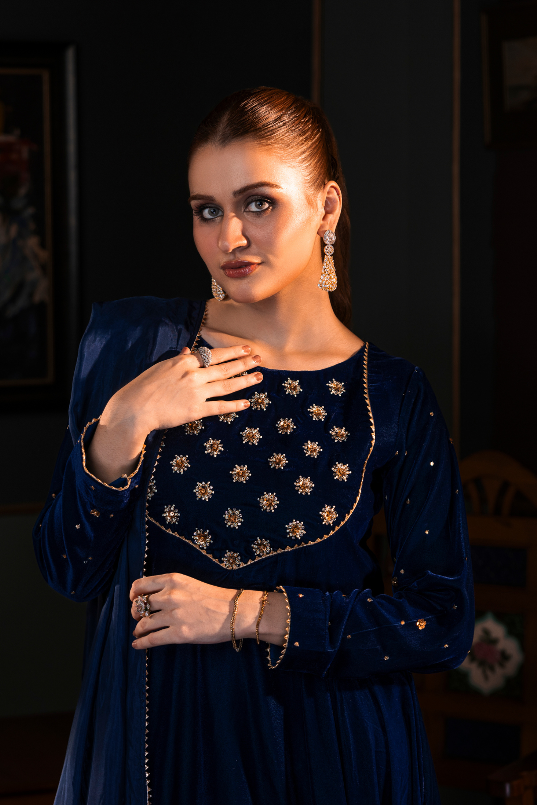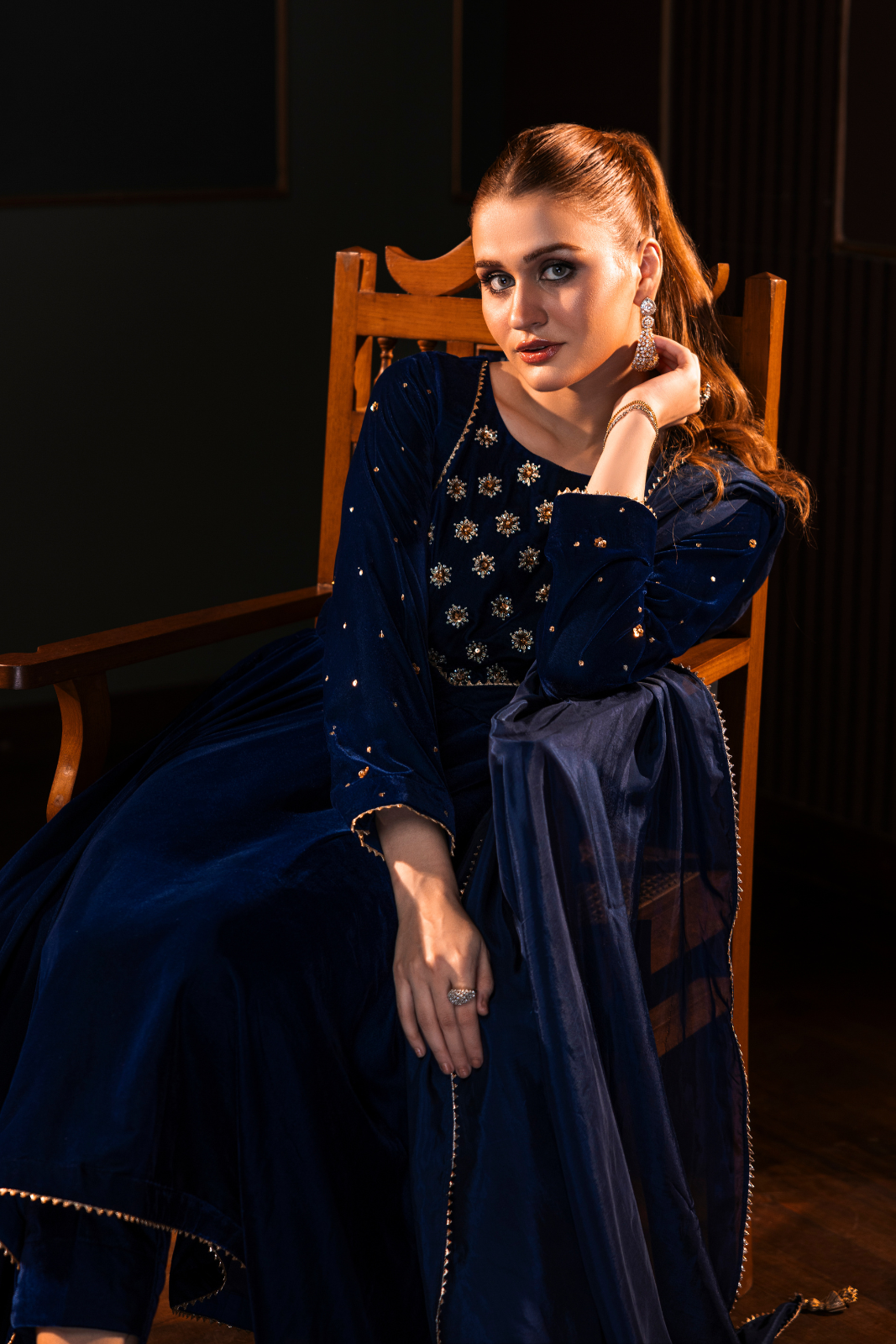 Elevate your festive style with Velroza, a regal 3-piece velvet ensemble crafted for timeless elegance. The dropped corner Pishwas, adorned with intricate handwork of Kora, Dabka, Resham, Sitara, and Sequins, showcases exquisite craftsmanship. Paired with straight pants and a medium silk dupatta finished with lace and tassels, this look is a perfect blend of tradition and modern sophistication.