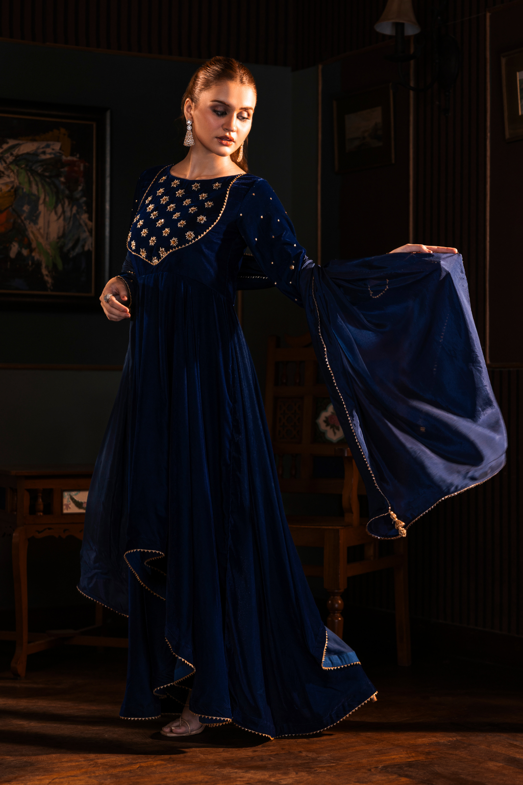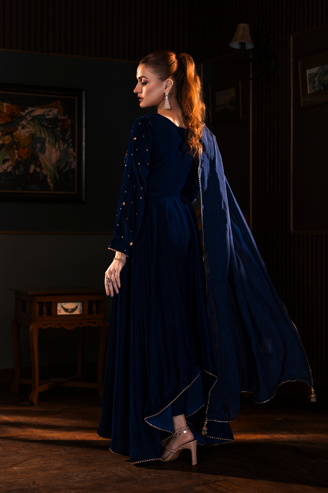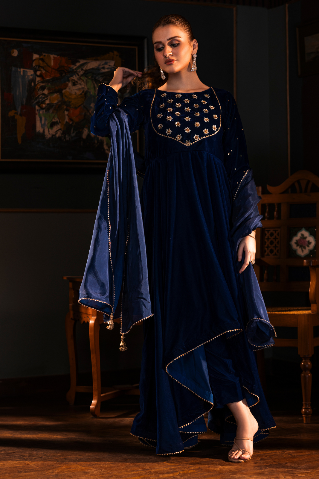 Elevate your festive style with Velroza, a regal 3-piece velvet ensemble crafted for timeless elegance. The dropped corner Pishwas, adorned with intricate handwork of Kora, Dabka, Resham, Sitara, and Sequins, showcases exquisite craftsmanship. Paired with straight pants and a medium silk dupatta finished with lace and tassels, this look is a perfect blend of tradition and modern sophistication.