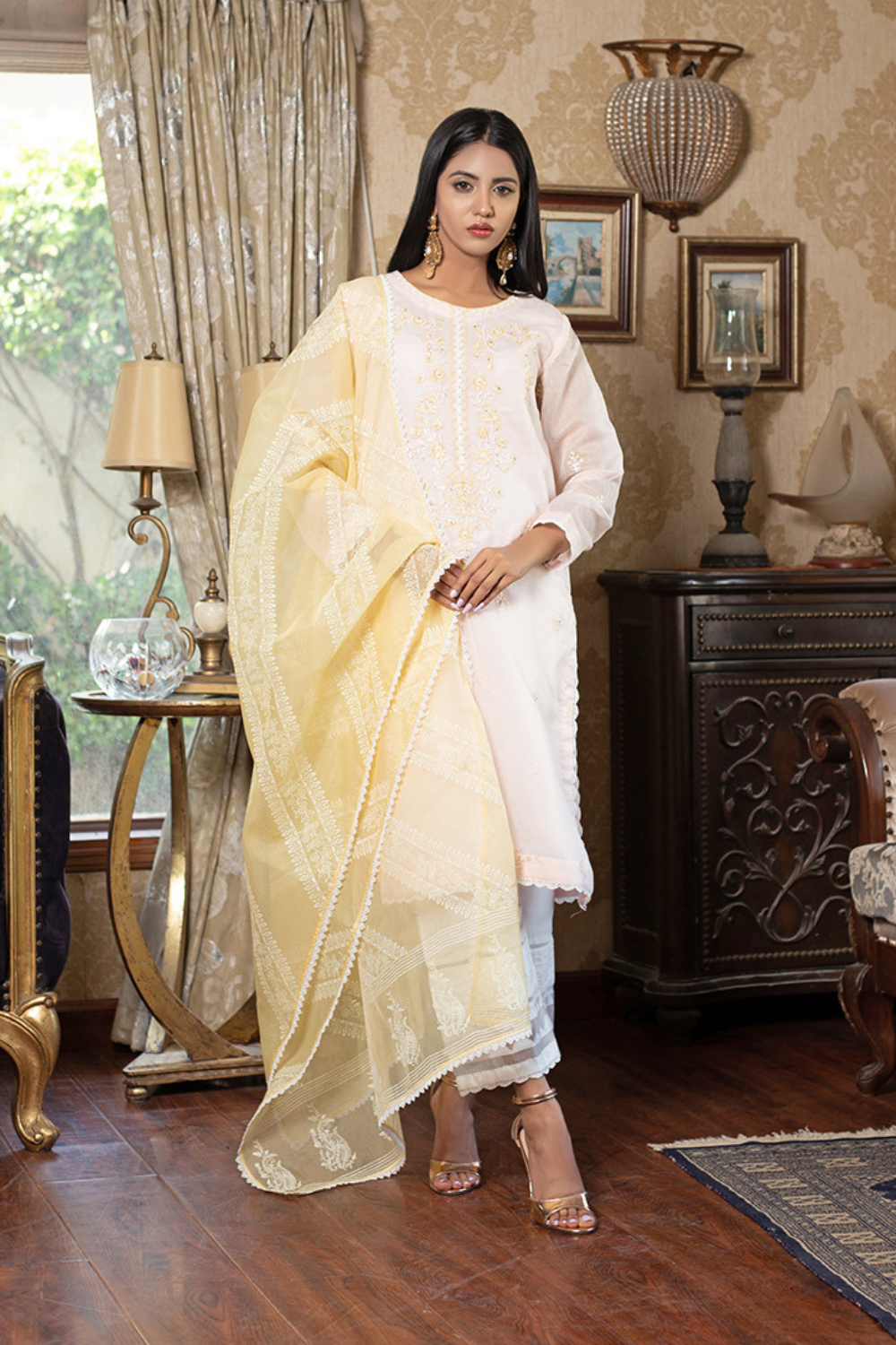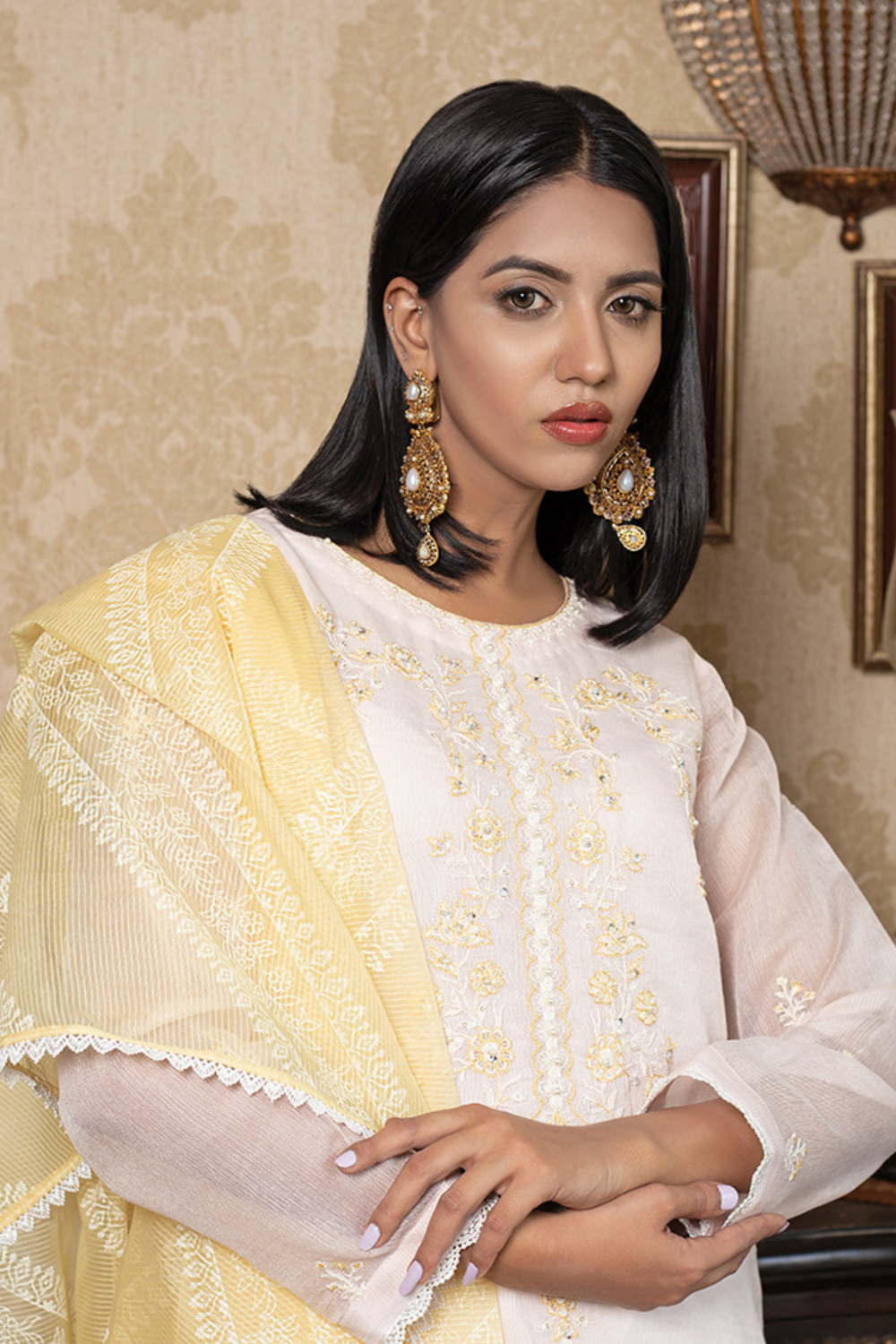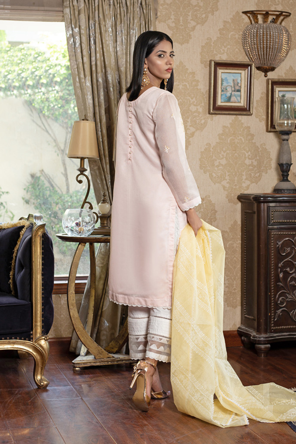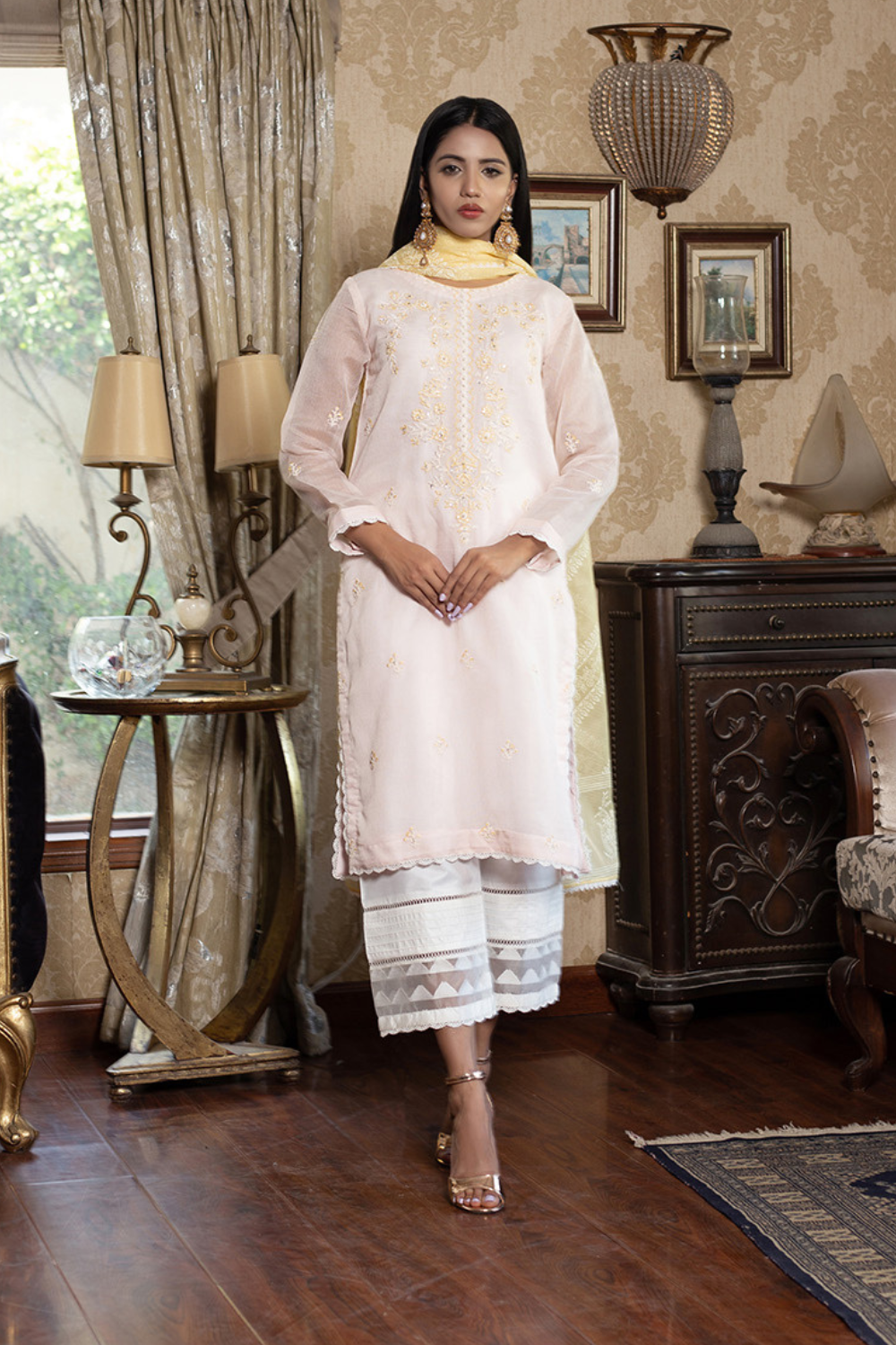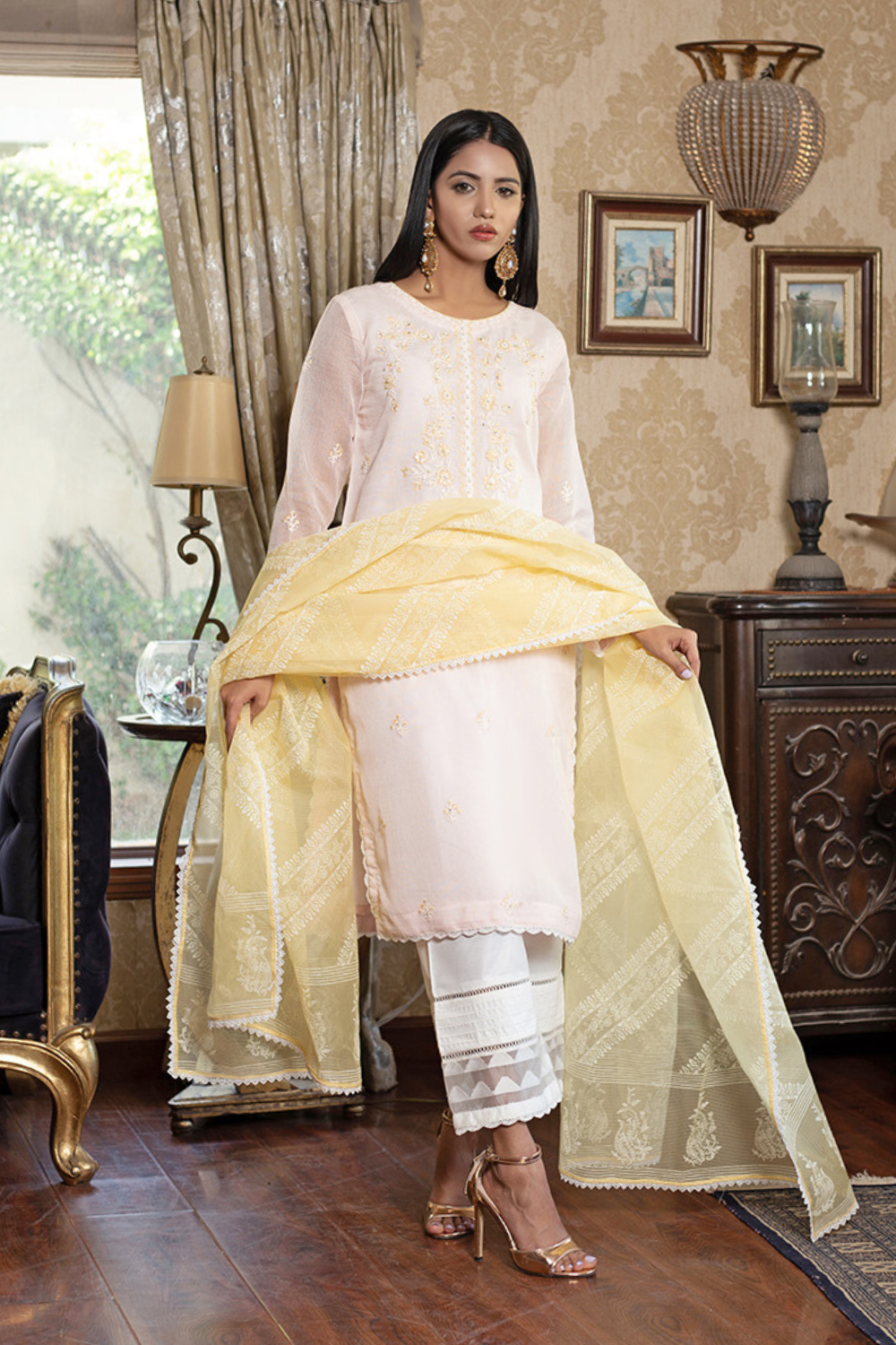 Introducing "YARA" – a symbol of timeless elegance for the modern Pakistani woman. In a serene Light Pink hue, the Khaddi Net Shirt is intricately embroidered and adorned with pearls, radiating opulence at every turn. Paired with a Cotton Trouser delicately adorned with laces, and complemented by an Organza Dupatta featuring enchanting Screen Print, YARA embodies the perfect fusion of tradition and sophistication.