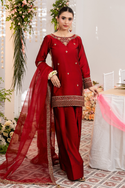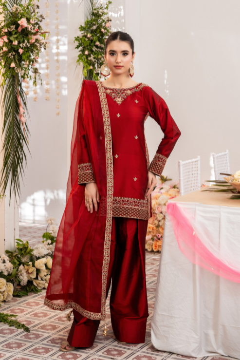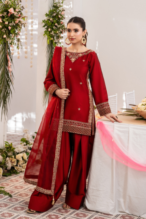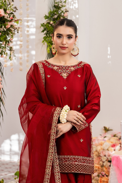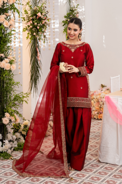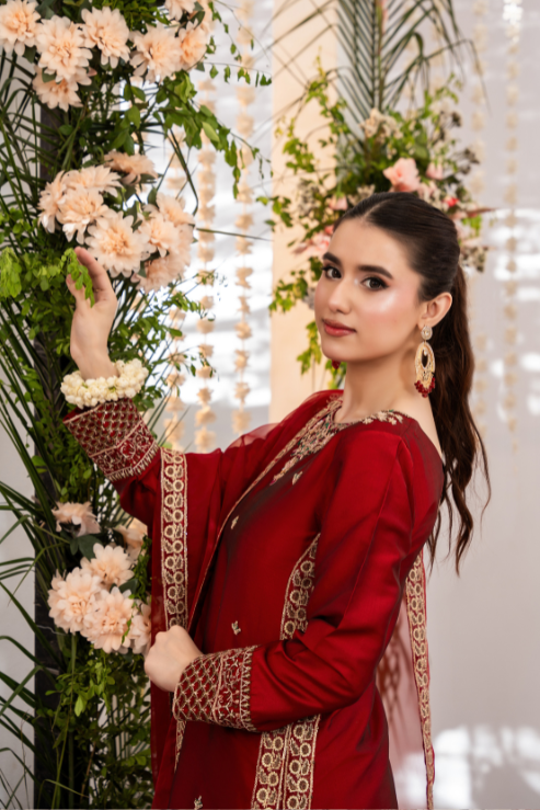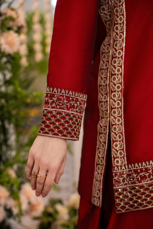 Zara is where traditional craft meets festive finesse. The rich red Katan silk shirt is elevated with intricate handwork in kora, dabka, resham, and embroidery, perfectly paired with a timeless farshi shalwar. Finished with an organza dupatta trimmed in four-sided embroidered lace
