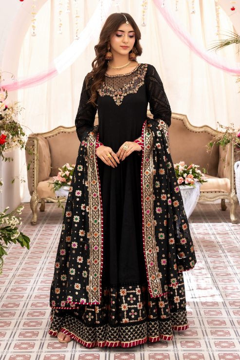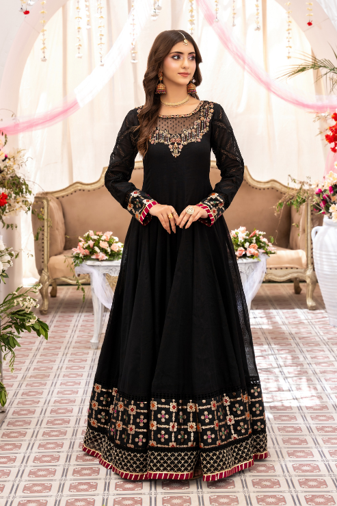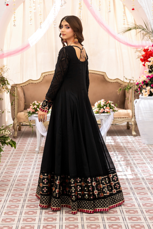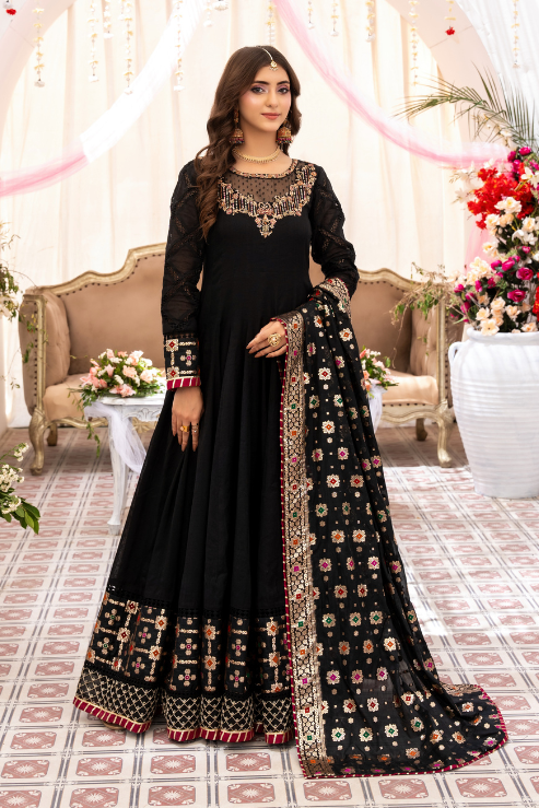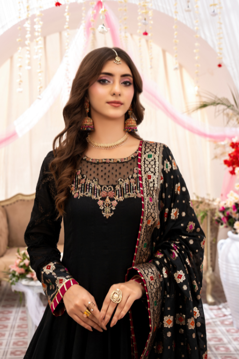 This festive season in Zarlish—a jet black tasser silk frock adorned with intricate handwork on the neckline featuring kora, dabka, and moti on organza. Paired with a regal jacquard dupatta, this 2-piece set is your go-to for timeless elegance and modern flair