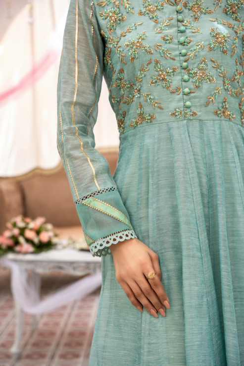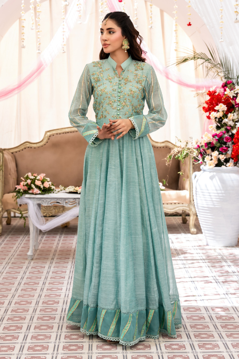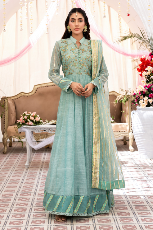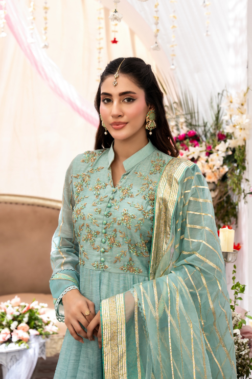 Adorned with intricate handwork of kora, crystals, and sitara, this sky blue tasser silk frock is a vision of grace. Paired with an organza dupatta finished in luxe jamawar, it’s made for the woman who loves soft glam with festive flair.