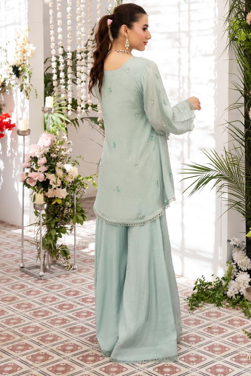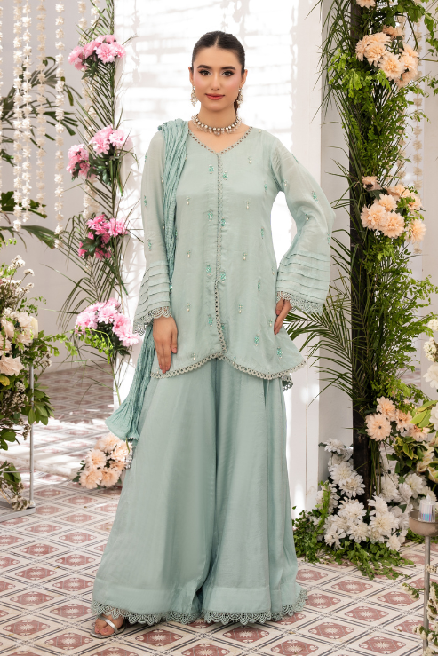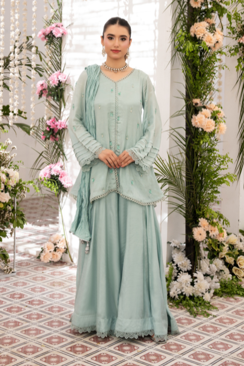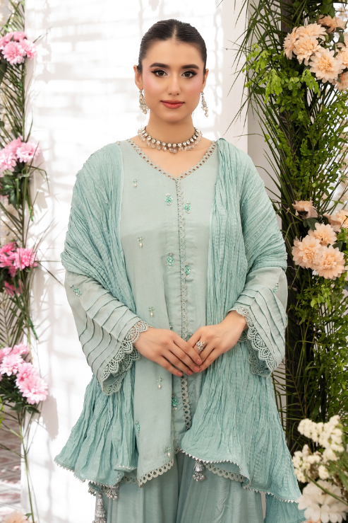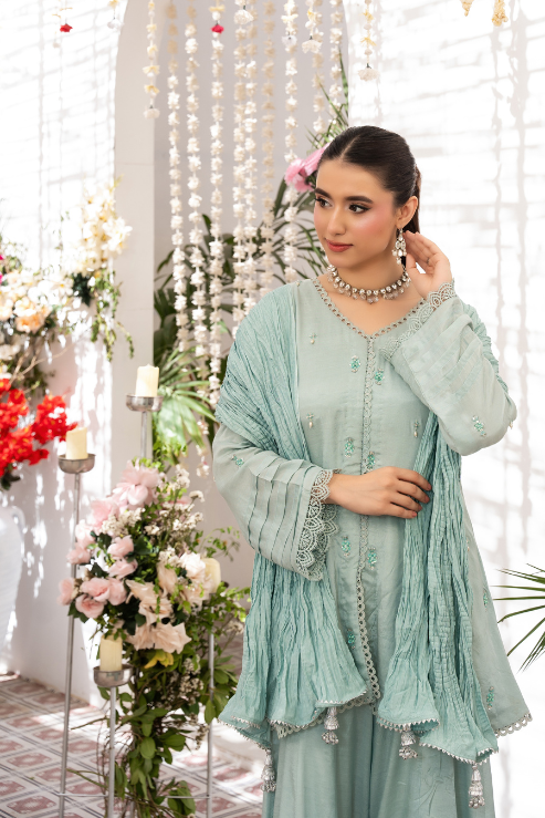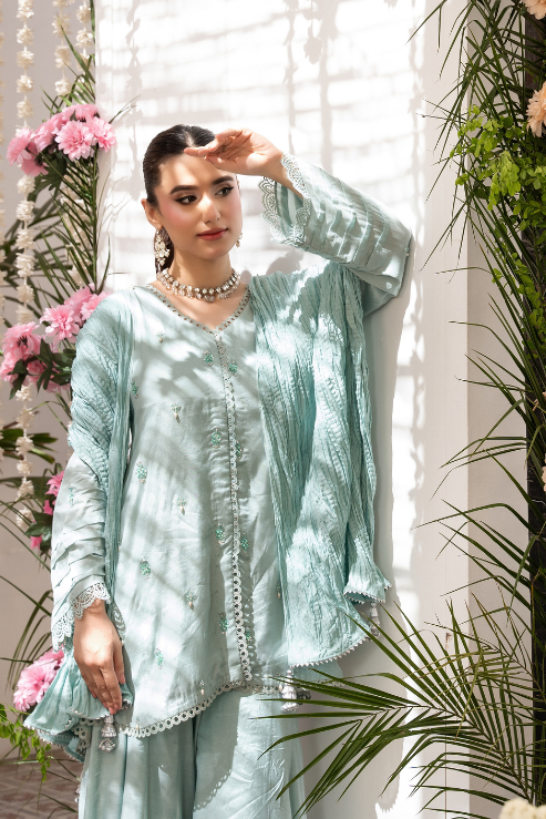 3-piece stunner features intricate handwork on the front, back, and sleeves — adorned with pearls, sequins, and delicate stones. Paired with a lace-trimmed Dhaka and a crushed dupatta finished with lace and tassels